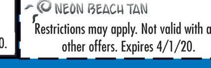 $700 $5999 FREE $10 OFF Want a FREE TAN ? Text “neon” to 411669 State-of-the-Art Beds MULTIPLE LEVELS OF TANNING $14 99 MHERST OCKY IDDLEBURG 19585 D IVER ) • R • 440-333-3050 $4999 30% OFF FREE $1999 Restrictions May apply. Not valid with Restrictions May apply. Not valid with any other o ers. Expires 12/31/20 Restrictions May apply. Not valid with any other o ers. Expires 12/31/20 Restrictions May apply. Not valid with any other o ers. Expires 12/31/20 Restrictions May apply. Not valid with any other o ers. Expires 12/31/20 3 SPRAY TANS LOTION BOTTLES & 2 FREE TANS BUY 1 MONTH & GET A 5TH WEEK 5 TANS ANY LEVEL BED NEW CUSTOMERS ONLY $99 UNLIMITED TILL THE END OF THE YEAR! BIGGEST SALE OF THE YEAR!