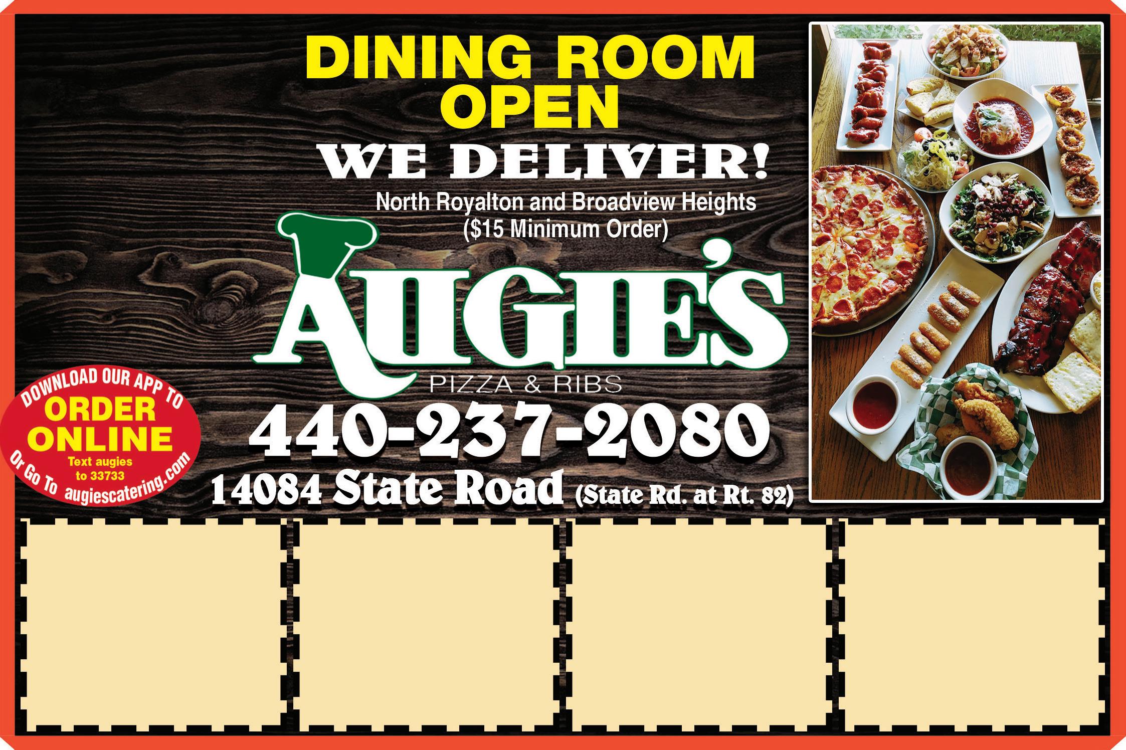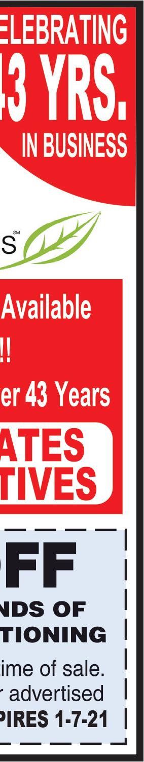 $5.00 OFF One coupon per order. Not valid with any other offer, coupon or special. Pick up or delivery only. Coupon must be presented/mention at time of order. Limited Time Offer. RIB FAMILY SPECIAL • 2 Whole Slabs of Ribs • 4 Orders of Cole Slaw • 4 Pieces of Garlic Bread w/Cheese • 1 FREE 2-Liter of Coke® $4795 SAVE $25 SPORTS SPECIAL • Large 16” 1-Topping Pizza • 10 Bone in Wings • 1 FREE 2-Liter of Coke $2595 2 MEDIUM 1-TOPPING* PIZZAS $1995 code: 2mdsale 2 LARGE 1-TOPPING* PIZZAS $2595 code: 2mlgsale -ORNot valid with any catering menu item. One coupon per order. Not valid with any other offer, coupon or special. Pick up or delivery only. Coupon must be presented/mention at time of order. Limited Time Offer. Any Order of $30 or More code: 5discount OPEN on CHRISTMAS EVE for all your Catering Needs! Pre-Bake Meals Available for Pickup and Delivery Veggie or Meat Lasagna Chicken Parmesan Stuffed Chicken with Brie Chicken Marsala www.augiescatering.com RESIDENTIAL & COMMERCIAL FLOORING 330-952-1046 Serving Medina County Since 1997 EmeraldFinishingGroup.com Any Complete Flooring Project Expires 1-31-2021 Specializing in: • Epoxy Flooring • Concrete Polishing • Wood & Vinyl Laminate • Carpet, Tile, Stone Great for Any Concrete Surface: Basements & Garages