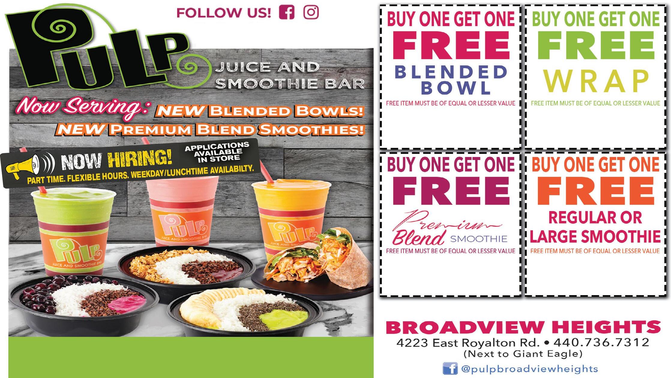 BRECKSVILLE • BROADVIEW HEIGHTS December 2020 Shop locally. Save locally. 1/15/21 1/15/21 1/15/21 through dine in only dine in / togo dine in / togo PULPJUICEANDSMOOTHIE.COM Smoothies, Healthy Wraps, Salads, Fresh Fruit and Vegetable Juice, Nutritious Wheatgrass! Valid at Broadview Heights location only. One coupon per customer per visit. Offers cannot be combined. Must present coupon at time of purchase. Expires 12-31-2020 Valid at Broadview Heights location only. One coupon per customer per visit. Offers cannot be combined. Must present coupon at time of purchase. Expires 12-31-2020 Valid at Broadview Heights location only. One coupon per customer per visit. Offers cannot be combined. Must present coupon at time of purchase. Expires 12-31-2020 Valid at Broadview Heights location only. One coupon per customer per visit. Offers cannot be combined. Must present coupon at time of purchase. Expires 12-31-2020 We are open: Mon-Fri 6:30am-9:00pm • Sat-Sun 9:00am-9:00pm