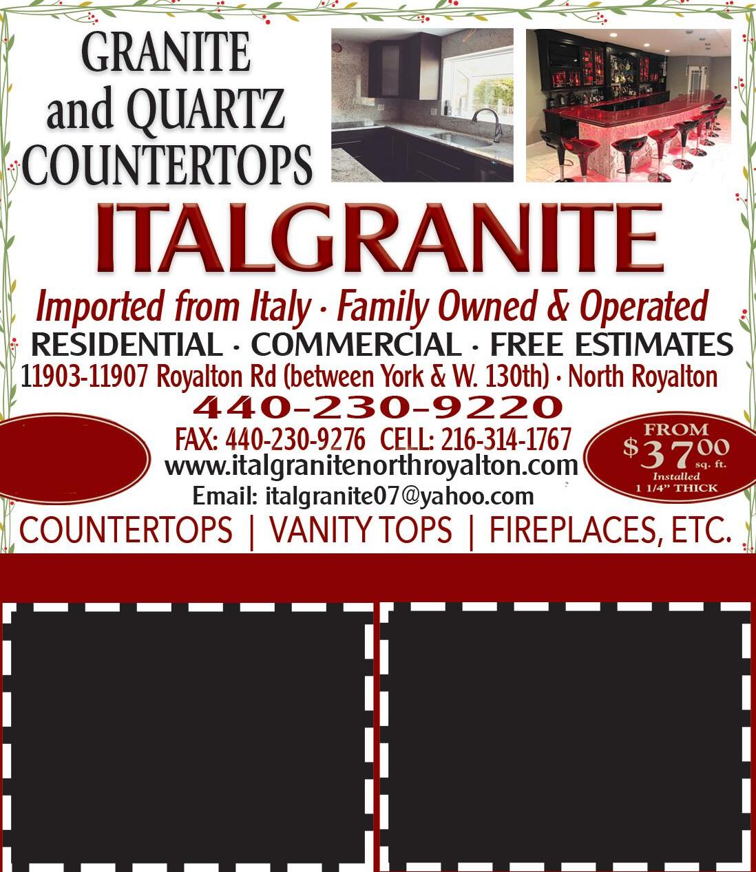 15, 2021 POSTAL CUSTOMER PRSRT STD ECRWSS U.S. POSTAGE PAID Town Money Saver, Inc. townmoneysaver.com with purchase of granite or quartz Kitchen countertop 45 sq. ft. or more Valid only with coupon. Not valid with any other coupons or discounts. Expires 1/7/21 with purchase of granite or quartz Kitchen countertop 75 sq. ft. or more Valid only with coupon. Not valid with any other coupons or discounts. Expires 1/7/21 Open: Mon-Fri 8am-6pm Saturday 9am-2pm FREE STAINLESS STEEL SINK FREE REMNANT PIECE FOR BATHROOM VANITY QUICK INSTALLATION-2 WEEKS OR LESS FROM TEMPLATE