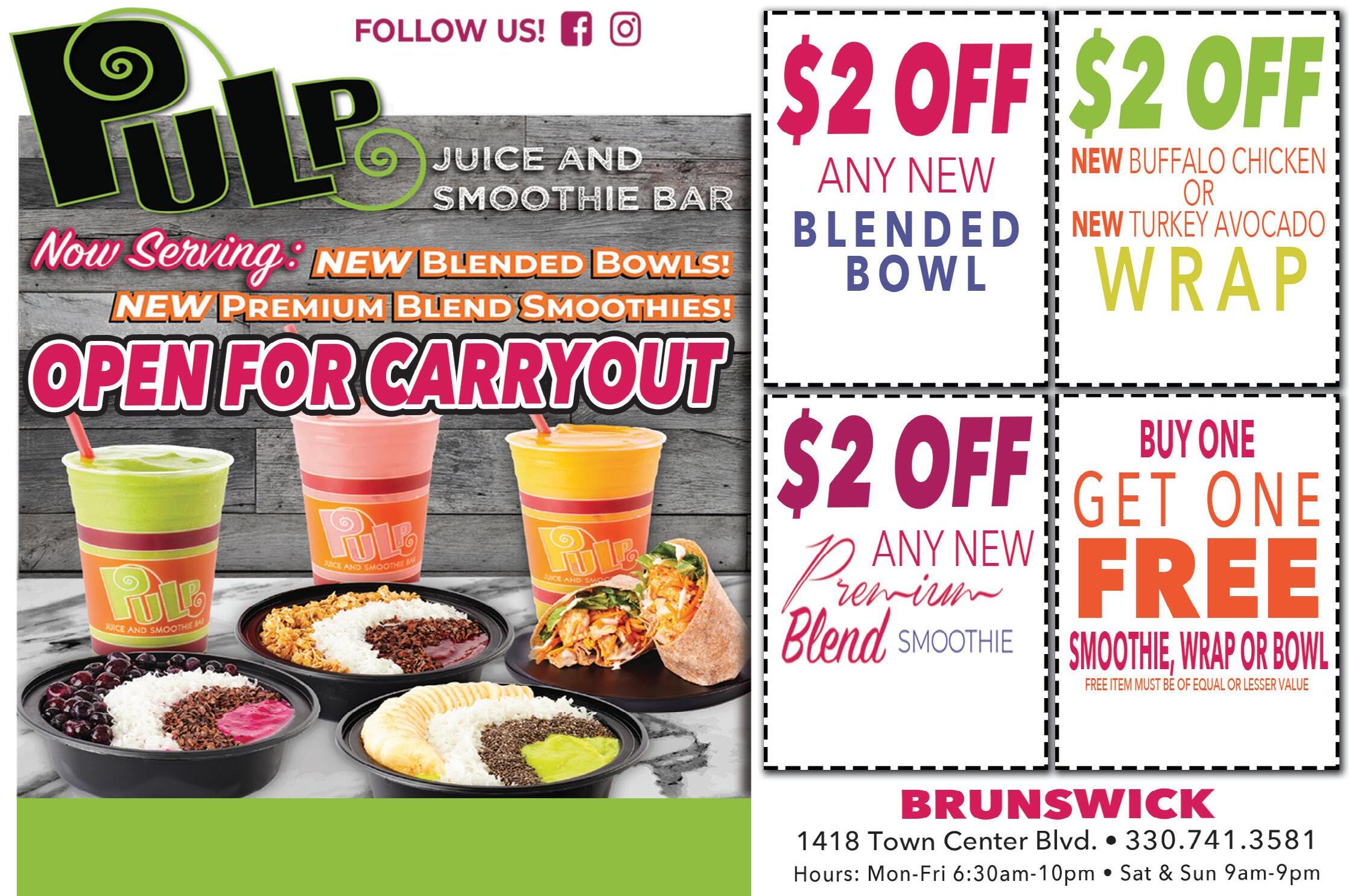 BRUNSWICK May 2020 Shop locally. Shop safely. Support LOCAL businesses! One coupon per customer per visit. Not valid with any other offer. Valid at 1319 N Carpenter & 1799 Pearl locations only. Expires 6-15-20. One coupon per customer per visit. Not valid with any other offer. Valid at 1319 N Carpenter & 1799 Pearl locations only. Expires 6-15-20. One coupon per customer per visit. Not valid with any other offer. Valid at 1319 N Carpenter & 1799 Pearl locations only. Expires 6-15-20. DOZEN COOKIES FREE With Purchase of Party Sub BUY ONE, GET ONE FREE Buy ANY 6 inch sub and 21oz drink and get ANY 6 inch sub of equal or lesser price FREE One coupon per customer per visit. Not valid with any other offer. Valid at 1319 N Carpenter & 1799 Pearl locations only. Expires 6-15-20. FREE DELUXE OPTION 50% MORE MEAT Offer not valid on promotional sandwiches. One coupon per customer per visit. Not valid with any other offer. Valid at 1319 N Carpenter & 1799 Pearl locations only. Expires 6-15-20. Any Regular Footlong $6 Any Footlong Other than Tuesday Special Any 6” Sub 50¢ OFF $1 OFF PULPJUICEANDSMOOTHIE.COM Smoothies, Healthy Wraps, Salads, Fresh Fruit and Vegetable Juice, Nutritious Wheatgrass! Valid at Brunswick location only. One coupon per customer per visit. Offers cannot be combined. Must present coupon at time of purchase. Expires 6-30-2020 Valid at Brunswick location only. One coupon per customer per visit. Offers cannot be combined. Must present coupon at time of purchase. Expires 6-30-2020 Valid at Brunswick location only. One coupon per customer per visit. Offers cannot be combined. Must present coupon at time of purchase. Expires 6-30-2020 Valid at Brunswick location only. One coupon per customer per visit. Offers cannot be combined. Must present coupon at time of purchase. Expires 6-30-2020