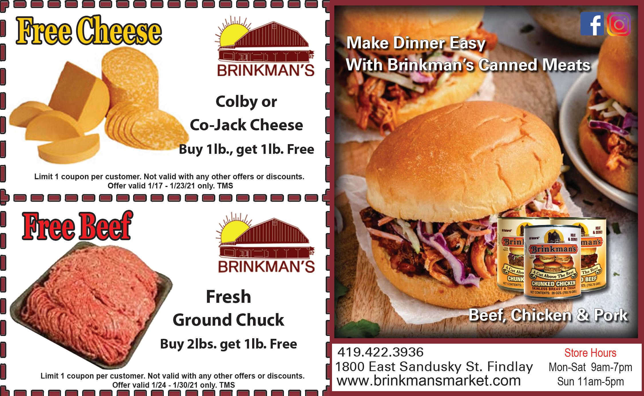 BEEF SIDE 3-2lb. Round steaks 4-16oz. Porterhouse steaks 3-2lb. Sirloin steaks 4-12oz. T-bone steaks 4-8oz. Strip steaks 2-3lb. Chuck roasts 2-3lb. English roasts 1-3lb. Rump roast 6-1lb. Beef patties 12-1lb. Ground chuck ONLY $249.99 400 Trenton Ave. Findlay WE ACCEPT EBT FIND US ON FACEBOOK OPEN: Monday - Saturday LIL’ BEEF PACK 2-2lb. Round steak 1-2lb. Sirloin steaks 2-3lb. Chuck roasts 1-3lb. Rump roast 3-1lb. Beef for stew 1-1lb. Chopped sirloin patties 6-1lb. Ground chuck