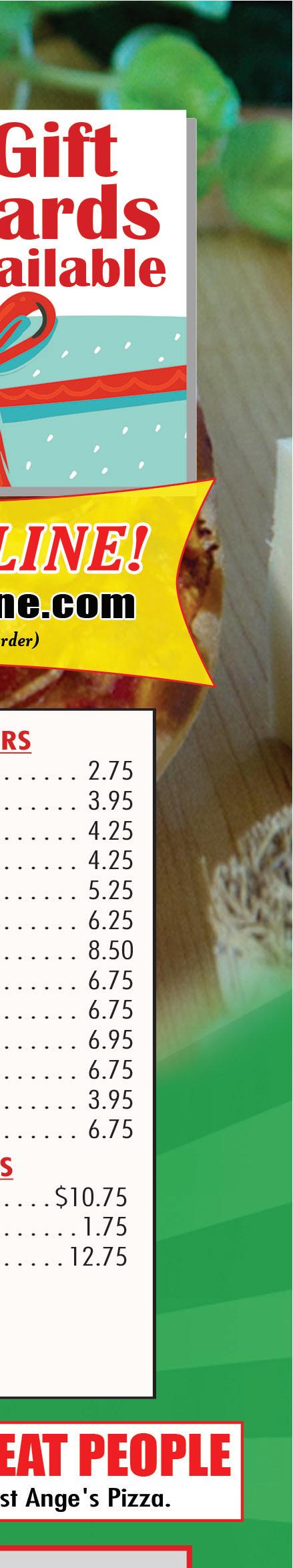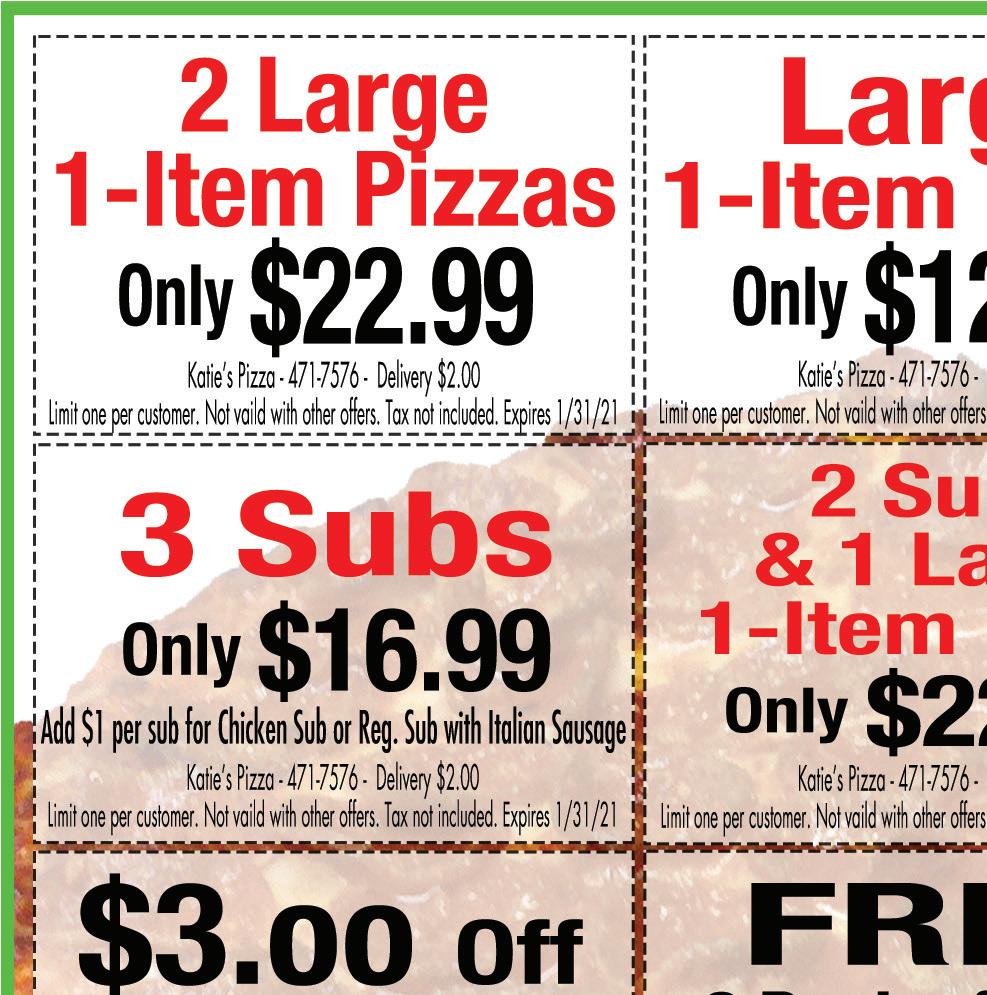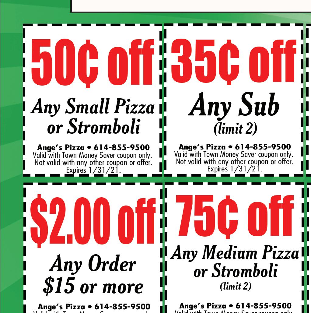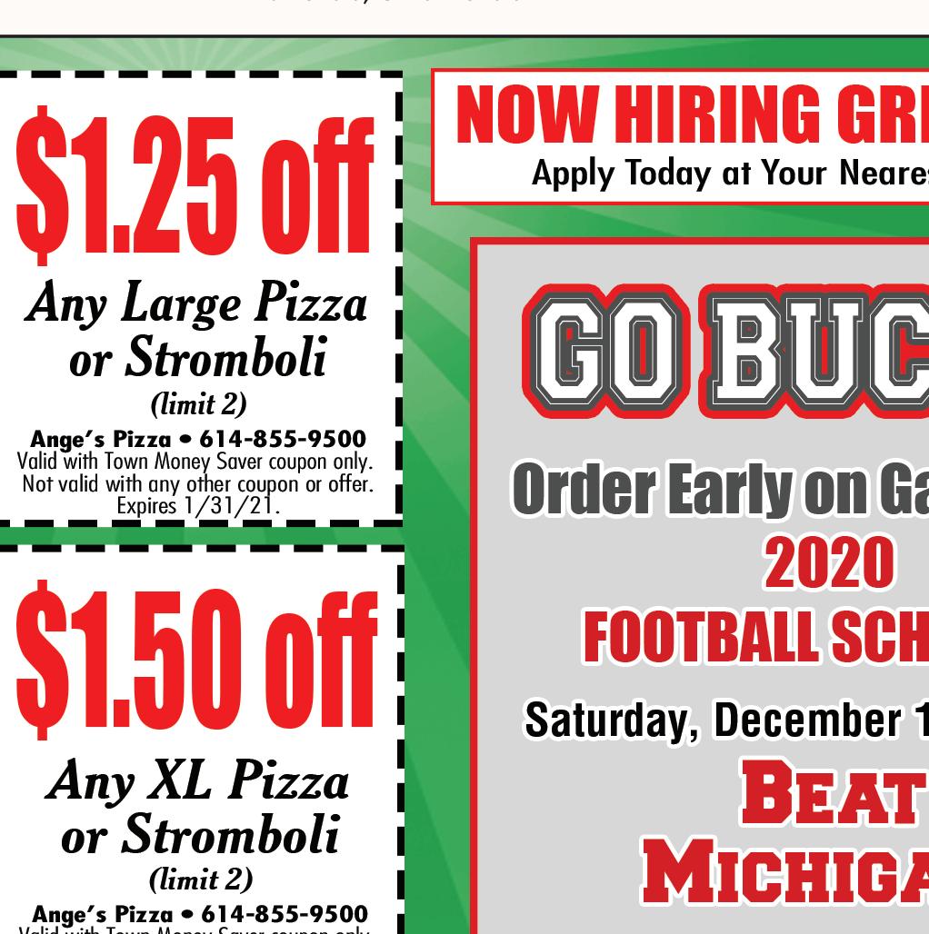 614-855-5858 4926 Morse Rd. Columbus OPEN FOR CARRY OUT & DELIVERY Temporary Hours: Sun-Thurs 11am-8pm; Fri & Sat 11am-9pm With this Town Money Saver coupon only. Cannot be combined with any other offers. Must present coupon. Expires 1/31/21. TMS With this Town Money Saver coupon only. Cannot be combined with any other offers. Must present coupon. Expires 1/31/21. TMS With this Town Money Saver coupon only. Cannot be combined with any other offers. Must present coupon. Expires 1/31/21. TMS With this Town Money Saver coupon only. Cannot be combined with any other offers. Must present coupon. Expires 1/31/21. TMS With this Town Money Saver coupon only. Cannot be combined with any other offers. Must present coupon. Expires 1/31/21. TMS $2 OFF Item Pizza $4 OFF 20% OFF Any order $5 OFF FREE Garlic Cheese Bread with any 16” Pizza We deliver with Just click on deliver on our website We Can Make Individual Pizzas & Box Lunches For Your Catering Event! One coupon per person per visit per day. Not to be combined with other offers. No cash value. Redeemable in person only. Hurry! Offer expires 1/7/21. Code: 0201. One coupon per person per visit per day. Not to be combined with other offers. No cash value. Redeemable in person only. Hurry! Offer expires 1/7/21. Code: 02109 One coupon per person per visit per day. Not to be combined with other offers. No cash value. Redeemable in person only. Hurry! Offer expires 1/7/21. Code: 0205 VALID AT 332 S. Hamilton Road & 1340 N. Hamilton Road • GAHANNA LOCATIONS ONLY VALID AT 332 S. Hamilton Road & 1340 N. Hamilton Road • GAHANNA LOCATIONS ONLY VALID AT 332 S. Hamilton Road & 1340 N. Hamilton Road • GAHANNA LOCATIONS ONLY VALID AT 332 S. Hamilton Road & 1340 N. Hamilton Road • GAHANNA LOCATIONS ONLY BUY ANY 2 GIANT SUBS GET A THIRD GIANT SUB* $4.99! $1.00 OFF! ANY REGULAR SUB $2.00 OFF! ANY GIANT SUB FREE CHIP AND REGULAR FOUNTAIN DRINK *of equal or lesser value WITH ANY SIZE SUB One coupon per person per visit per day. Not to be combined with other offers. No cash value. Redeemable in person only. Hurry! Offer expires 1/7/21. Code: 0204 Gift Cards Make GREAT Gifts! ENJOY $5.00 off $25.00 ENJOY $5.00 off $25.00 Buy one entree get one 1/2 OFF Buy one entree get one 1/2 OFF One coupon per check, please. Expires 1/31/21. One coupon per check, please. Expires 2/28/21. (Of equal or lesser value ) One coupon per check, please. Expires 1/31/21. (Of equal or lesser value ) One coupon per check, please. Expires 2/28/21. DECEMBER JANUARY