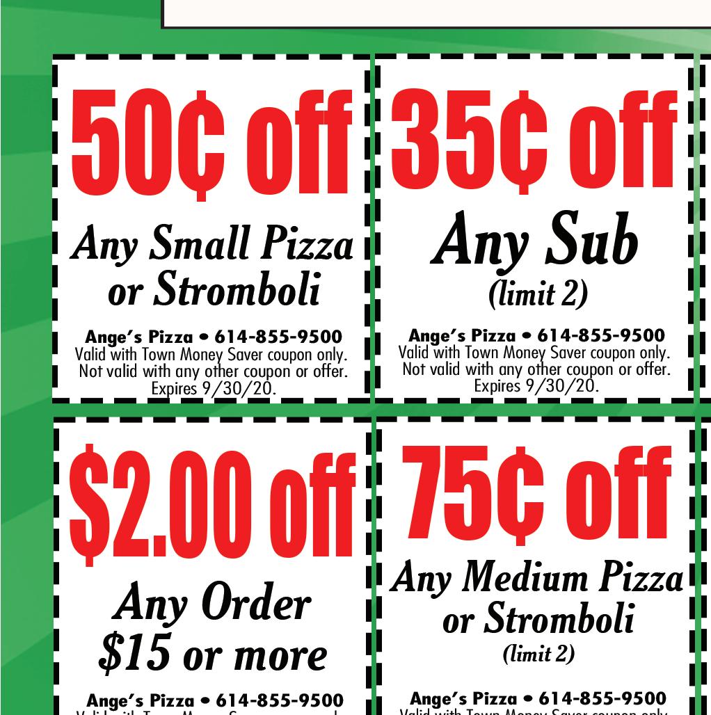 614-855-5858 4926 Morse Rd. Columbus OPEN FOR CARRY OUT & DELIVERY Temporary Hours: Sun-Thurs 11am-8pm; Fri & Sat 11am-9pm With this Town Money Saver coupon only. Cannot be combined with any other offers. Must present coupon. Expires 9/10/20. TMS With this Town Money Saver coupon only. Cannot be combined with any other offers. Must present coupon. Expires 9/10/20. TMS With this Town Money Saver coupon only. Cannot be combined with any other offers. Must present coupon. Expires 9/10/20. TMS With this Town Money Saver coupon only. Cannot be combined with any other offers. Must present coupon. Expires 9/10/20. TMS With this Town Money Saver coupon only. Cannot be combined with any other offers. Must present coupon. Expires 9/10/20. TMS $1 OFF Any Half Grinder $2 OFF Any Whole Grinder $2 OFF Item Pizza $4 OFF $5 OFF FREE Garlic Cheese Bread with any 16” Pizza We deliver with Just click on deliver on our website We Can Make Individual Pizzas & Box Lunches For Your Catering Event!