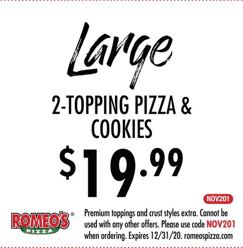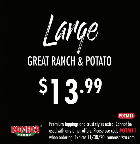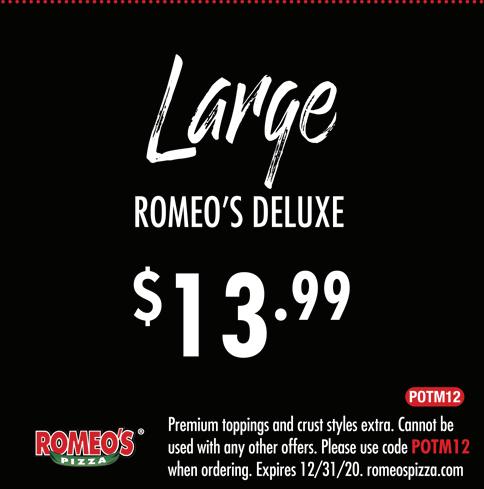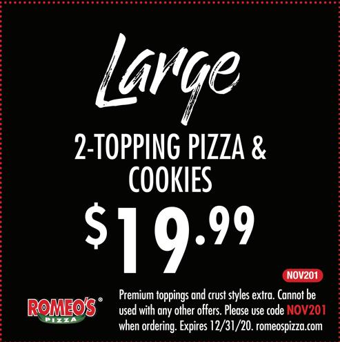 HILLIARD Published By Town Money Saver, Inc. Corporate Office • PO Box 356 • Lucas, OH 44843 © 2020 TMS Franchising, Inc. All rights reserved. For advertising information, call Mike 614-362-5111 NEXT ISSUE IN HOMES: February 11, 2021 ADVERTISING DEADLINE: January 29, 2021 POSTAL CUSTOMER PRSRT STD ECRWSS U.S. POSTAGE PAID Town Money Saver, Inc. townmoneysaver.com Mon-Thurs: 11am-10pm Fri: 11am-11pm Sat: 11:30am-11pm Sun: 11:30am-9pm 8TH YEAR IN BUSINESS $5 Off A $25 Food Purchase (excludes alcohol) One per table/group, not valid with any other offers or specials,restrictions apply, alcohol does not apply towards Buy One, Get One FREE Lunch Entrée One per table/group, not valid with any other offers or specials,restrictions apply. 3861 Park Mill Run Dr. • Hilliard, OH 43026 614-777-7996 1/2 Off Any Lunch Entrée One per table/group, not valid with any other offers or specials,restrictions apply. Fresh. Homemade. Authentic. OPEN FOR DINE IN! CARRY OUT & DELIVERY AVAILABLE THROUGH: Holidays are coming! Ask us about our Gift Cards!!! Gift Card ORDER ONLINE AT ROMEOSPIZZA.COM OR DOWNLOAD OUR APP CARRYOUT CATERING DELIVERY 614-527-0044 • 3189 HILLIARD ROME RD. HILLIARD