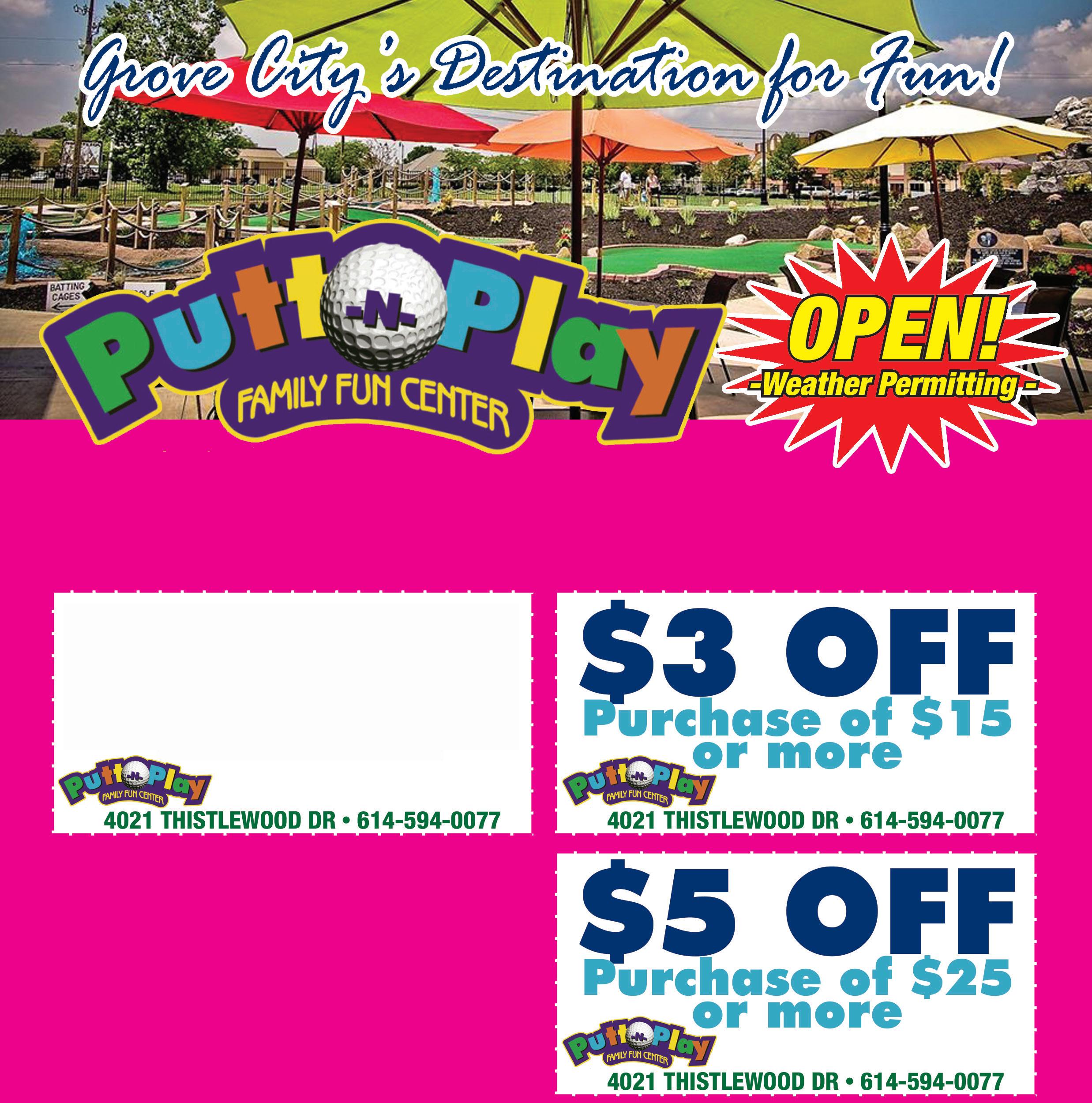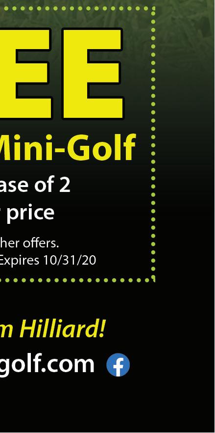 Must present coupon. One per visit. Not valid with any other offers. Expires 10/15/20 Must present coupon. One per visit. Not valid with any other offers. Expires 10/15/20 puttnplayfuncenter.com COVID-19 COMPLIANT Visit our website for details! MINIATURE GOLF SOCCER CAGES BATTING CAGES See our online booking! ENJOY A FREE GIFT ON YOUR BIRTHDAY! Registered guests will receive: 1 Round of golf • 2 Cage tokens (Can be used on batting or soccer cages) Celebrate your birthday at Putt N Play with a FREE gift from us! Anyone of all ages can get a complimentary certificate voucher to use on their birthday. PUTT-N-PLAY BIRTHDAY CLUB Wheel Chair & Stroller Accessible 4021 THISTLEWOOD DR • GROVE CITY • Next to Home Depot • 614-594-0077 FOR HOURS OF OPERATION CALL OR CHECK FACEBOOK/PUTTPLAY OR WWW.PUTTNPLAYFUNCENTER.COM 5 FOR $5 CAGE COUPON Must present coupon. One per visit. Not valid with any other offers. Expires 10/15/20 Must bring own equipment and wavier must be signed. H H H ONLY 15 MINUTES FROM CEMETERY ROAD!