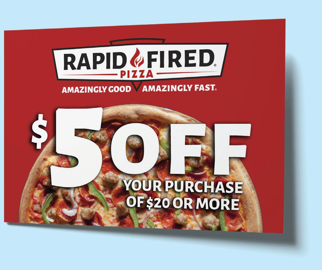 @rapi df i r e dpizz a FAMILY DEAL $5 OFF $20 $5 SINGLE-TOPPING Purchase one single-topping 9” or 11” pizza for only $5. Not valid with any other special or discount Limit 1 per visit. Expires 10/31/20. Limit 1 per visit. Expires 10/31/20. Limit 1 per visit. Expires 10/31/20. Limit 1 per visit. Expires 10/31/20. Not valid with any other special or discount Not valid with any other special or discount CODE: NO CODE NEEDED CODE: NO CODE NEEDED CODE: NO CODE NEEDED CODE: NO CODE NEEDED Not valid with any other special or discount Receive $5 off your next purchase of $20 or more. Get 2 large 2 topping pizzas, an order of Cheezy Bread, and a dessert pizza for only $24.95 2 for $14 Mix and match! Get two pizzas*, pastas, calzones or salads for only $14. Englewood 1080 S Main St GIVE THE GIFT OF PREMIUM PIZZA! BUY A $25 GIFT CARD, AND GET A $5 OFF CARD @rapidfiredpizza alid disc per per alid disc alid or disc alid disc BOGO Buy one regular priced pizza, pasta or calzone, and get another of equal or lesser value for free! *Excludes 14" pizzas. Gluten free crust available for an additional charge. HUBER HEIGHTS 6315 BRANDT PIKE