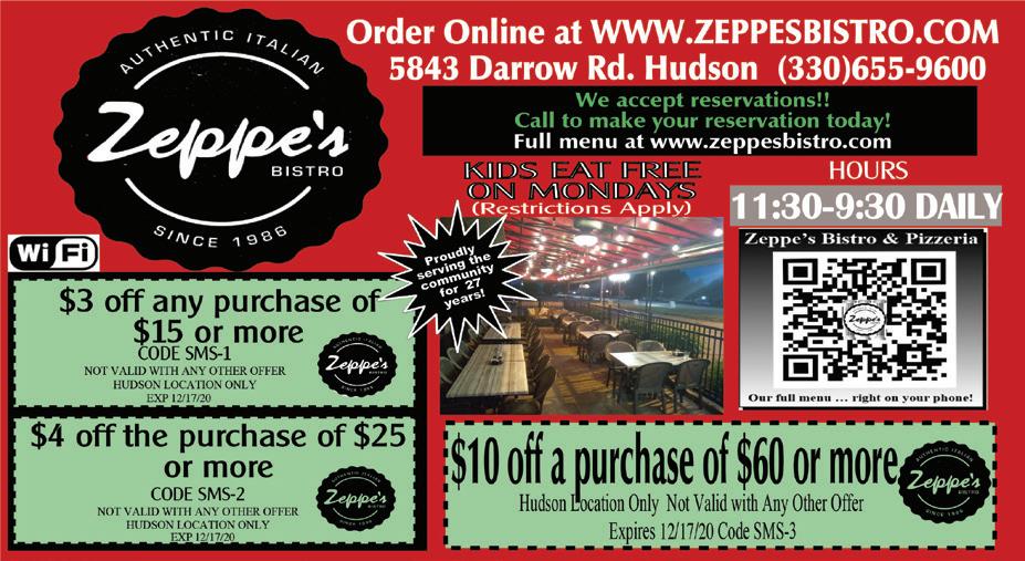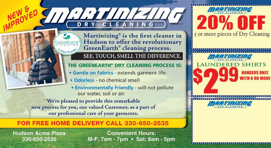 HUDSON To advertise, call 330-697-5145 Shop locally. Shop safely. Support LOCAL businesses! Dec 2020 / Jan 2021 FREE Home Delivery Please present coupon with incoming order. Not to be combined with other discounts. No cash value. limit 1 per household. Expires 1/14/21. Please present coupon with incoming order. Not to be combined with other discounts. Excludes laundered shirts, leather, suede, alterations and specialty garments. No cash value. limit 1 per household. Expires 1/14/21. Please present coupon with incoming order. Specialty shirts slightly higher. Expires 1/14/21.