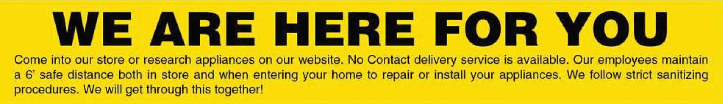 for emergency appliance delivery, installation, and repair to major home appliances. “No Contact” delivery services can be initiated by phone! Check out new appiances on our website; call our expert sales staff with your questions or requests! We’ll maintain a safe six-foot distance when we enter your home to conduct repairs or installation, and we follow strict sanitizing procedures.