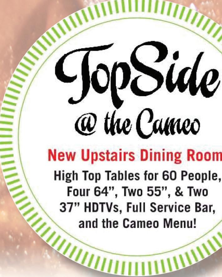 FAMILY PAK #1: 2 Lg. 2-topping pizzas & a small cheesybread $29.95 FAMILY PAK #2: Lg. 2-topping pizza, small Cheesybread, & breadsticks $19.99 SUPER PAK: 3 Lg. 1-topping pizzas & a medium Cheesybread $39.99 KIDS’ PAK: Lg. 1-topping pizza, cheese sticks, & Cinnabread $19.99 2 sm. 2-topping pizzas $14.95 Med. 2-topping pizza $9.99 Sub or Wrap 2 for $10.00 Lg. 2-topping pizza 6 boneless wings $17.95 Lg. 2-topping pizza $12.99 Med. specialty pizza $12.99 2 Lg. 2-topping pizzas $27.95 • • • SPECIALS • • • SANDUSKY 419-626-0187 HURON 419-433-0811 EXXON-MILAN 419-616-4444 WE’RE OPEN! We are doing the very best we can to ensure you have a SAFE family time at Cameo! OPEN for O.S.U. & Browns Games! Good Food Since 1936 ORDER ONLINE. IT’S TOO EASY! OPENING November 1 Friday nights only, for extra dining space RE-OPENING FOR PRIVATE PARTIES! Wishing everyone a HEALTHY & HAPPY THANKSGIVING!
