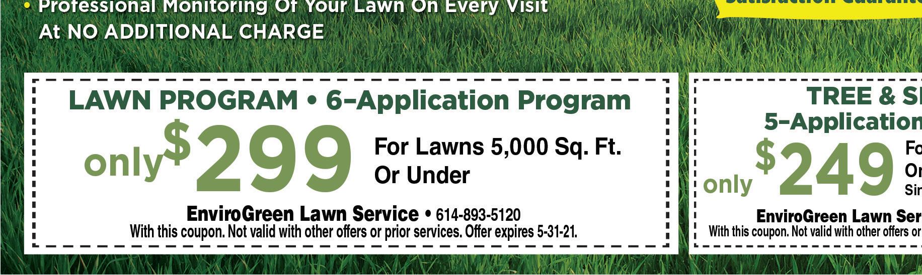 614-505-3511 bedlambricks.com Hours: Closed Mon, Tues-Fri 12-6, Sat 10-6, Sun 12-5 1230 E. powell rd • lewis center 10% OFF ANY SINGLE SET $100 OR LESS Expires 4/30/2021. Ages 3+ © 2021 Kumon North America, Inc. All rights reserved. Unlock Your Child’s Learning Potential with The Kumon Math and Reading Program. To learn more, schedule an orientation today! Kumon Math and Reading Center of Lewis Center Green Meadows Commerce Center 648 Bear Run Lewis Center, OH 43035 kumon.com/lewis-center | 614-883-6271 We’ll Take Care of your Lawn Just like It’s Our OWN Call (614) 808-4446 www.cardinallawns.com We also offer these additional services: • Insect & Grub Control • Pest & Mosquito Control • Tree & Shrub Care • Core Aeration NEW CUSTOMER SPECIAL $25 OFF FREE Any Program You Choose + 2 Free Soil Applications Grub Treatment with Pre-Pay Full Program Up to 15,000 sq. ft. New customers only. Not valid with any other offers. Expires 4/30/21. For your convenience, our services are continual. New customers only. Not valid with any other offers. Expires 4/30/21. For your convenience, our services are continual. “Technician is very considerate” Helen B., New Albany, OH “Cardinal Lawns did a fabulous job this year. It’s only our second year but the grass looks much better than it ever has in the 12 years we lived here. Can’t wait til you return” Mike W., Gahanna, OH • Seeding, Lawn Renovation, Slice Seeding • Mole Control FREE Mini Golf Buy 1 Round, Get a 2nd Round FREE FREE Mini Golf Buy 1 Round, Get a 2nd Round FREE ½ PRICE BATTING CAGE DEAL 5 Tokens* for $5 (reg. $10) *each token is 16 bats 1 coupon per visit, per transaction. Free round of equal value. With TMS coupon only. Not valid on any other discount or daily special. Expires 4/30/21. 1 coupon per visit, per transaction. Free round of equal value. With TMS coupon only. Not valid on any other discount or daily special. Expires 4/30/21. With TMS coupon only. Not valid with other offers or daily special. Expires 4/30/21.