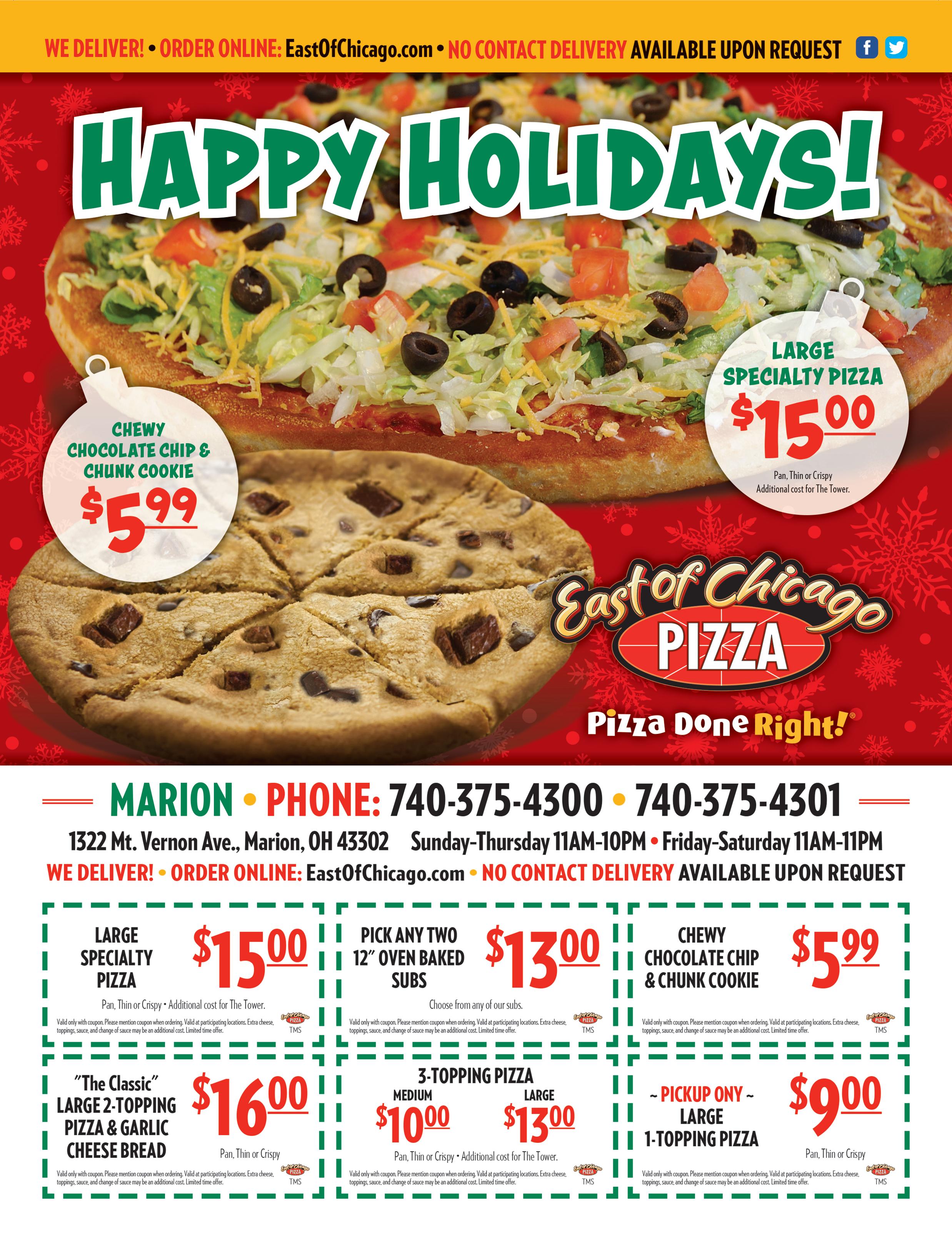 740-383-2791 • 810 Davids Street 18” 1-Item Pizza Only $999 Must Present Coupon. Expires 1/14/21 60 Pc. Snack Bucket Chicken Fingers, Mushrooms, Onion Rings, Corn Dogs, Pepperoni Sticks, Mozzarella Sticks, Assorted Veggies $2199 or 30 Pc. $1399 Must Present Coupon. Expires 1/14/21 20 Pc. Walleye Bucket With French Fries, Breadsticks and Choice of Cole Slaw, Potato Salad, Baked Beans or Macaroni Salad Only $2399 Must Present Coupon. Expires 1/14/21 16” Sub Sale Your Choice: Pizza, Italian, Ham, Turkey 1 Only $799 2 Only $1399 Must Present Coupon. Expires 1/14/21 20 Boneless Chicken Wings Your Choice: Regular, BBQ or Hot Only $1399 10 Pc. $6.99 Must Present Coupon. Expires 1/14/21 10 Char Burgers Sloppy Joe, Shredded Chicken or BBQ Pork & French Fries (Sorry No Mixing) ($29 Value) Only $1699 Must Present Coupon. Expires 1/14/21 Pizza Party Pack Giant 18” Pepperoni Pizza, 6 Chicken Wings (Your choice: hot, bbq or original) 6 Mozzarella Cheese Sticks, 6 Breadsticks (Choice of ranch dip or cocktail sauce) 1 lb of Potato Salad & Dessert Only $2799 Must Present Coupon. Expires 1/14/21 A $21 Value LARGE TRIPLE PEPPERONI PIZZA Only $1699 PEPPERONI 6 Garlic Cheese Breads with Coice of Cheese OR 8 Buffalo Chicken Chunks with Pizza Sauce Only $1699 Please be aware that since each order is made fresh to order that during busy times you may experience a longer than normal wait time but your food will be hot and fresh. We appreciate your patience in advance. Lasagna or Spaghetti Dinner With Salad and Garlic Bread Only $699 Must Present Coupon. Expires 1/14/21 Super Special Large Pizza With Your Choice of 3 Toppings (excludes extra cheese) Only $799 Must Present Coupon. Expires 1/14/21 Large Deluxe Salads Your Choice Mix & Match Chef Loaded or Taco Loaded 1 Only $799 2 Only $1399 Must Present Coupon. Expires 1/14/21
