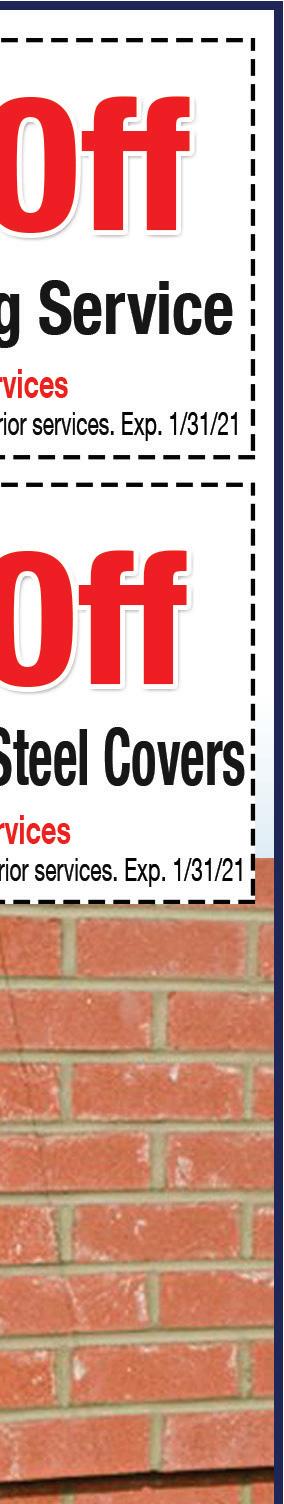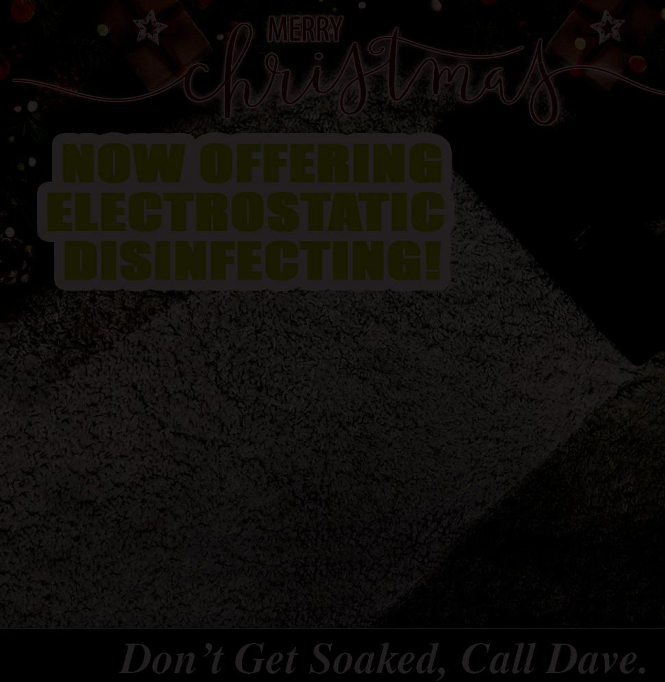 MARION December 2020 360° COVERAGE Kills 99.9% of Viruses & Germs Including Covid-19 CARPET CLEANING 5 AREAS ONLY $100 Expires 1/14/21 HOUSE CLEANING 5 HOURS ONLY $150 Expires 1/14/21 ADD ELECTROSTATIC DISINFECTANT ONLY $10 AN AREA Expires 1/14/21
