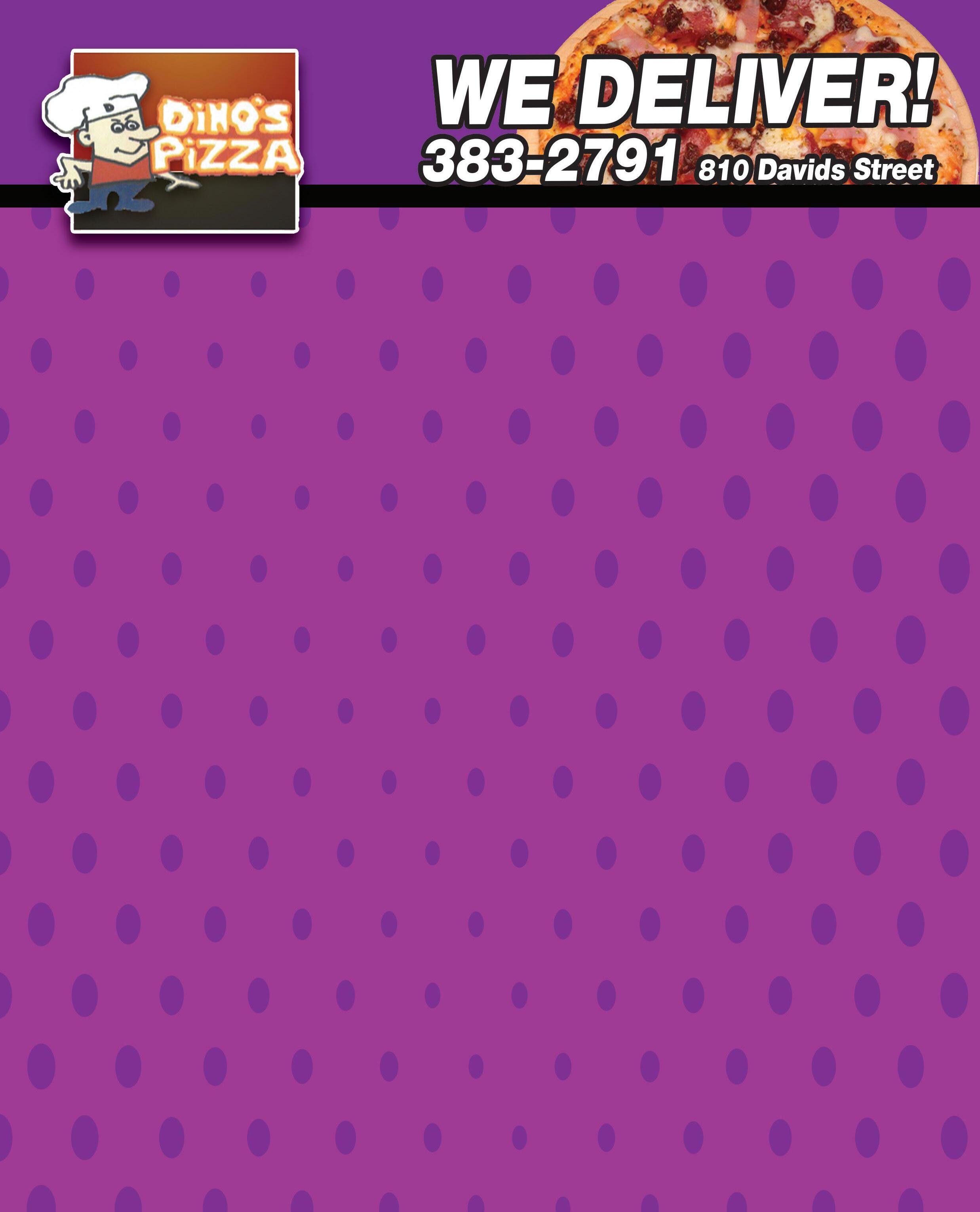 In Town Delivery $4 • Free In Town Delivery on Food Orders Over $30 Out Of Town Delivery Charge By Distance • Delivery Available 4pm-12am We Accept In Store Only No Checks On Delivery Monday - Sunday 2pm - Midnight 2 Large Five Item Deluxe Pizzas $18.99 2 Large Cheese Pizzas $10.99 2 Large Cheese Pizzas w/1 Item $12.99 2 Large Cheese Pizzas w/2 Item $14.99 EVERYDAY BUY 2 SPECIALS! Dine-In • Carry-Out • Drive-Thru • 810 Davids Street • 740-383-2791 Monday - Sunday 2pm - Midnight Super Special 10 Boneless Wings $6.99 Five Chicken Breast Strips $3.99 Six Jumbo Chicken Wings $6.79 (choice or bbq, hot or regular) Six Bread Sticks $3.00 (w/cheese or pizza sauce) 8 oz. Deep Fried Shrimp $5.99 Ten Mushrooms $3.50 Ten Onion Rings $3.50 French Fried Cauliflower $3.50 Nachos & Cheese $3.50 Cheese Fries $3.75 Chili Cheese Fries $4.25 Cheese Plate SM $7.50 MED $14.00 LG $20.00 Jalapeno Poppers (cream cheese or cheddar) SIX $5.50 FOUR $4.50 Six Mini Corn Dogs $2.50 Fried Mozzarella Cheese Sticks FIVE $3.99 EIGHT $4.99 Pepperoni Cheese Sticks $3.50 Two Bosco Sticks $3.99 w/choice of Pizza or cheese dip Spring Rolls FOUR $2.59 SIX $3.29 Cheese Curds $3.75 Pickle Fries TEN $2.99 TWENTY $3.99 Breaded Clams $5.99 Large Chef $7.99 Small Chef $4.99 Large Tossed $3.99 Small Tossed $2.49 1lb. Tub of Cole Slaw $3.99 1lb. Tub of Potato Salad $3.99 1lb. Tub of Macaroni Salad $3.99 1lb. Tub of Cottage Cheese $3.99 APPETIZERS SALADS Add cheese to any salad 75¢ extra 2 Piece Walleye Dinner $6.99 1/2 lb. Fried Shrimp Dinner $8.99 3 Piece Chicken Dinner $10.00 Seafood Delite Dinner Shrimp, Clams & Walleye $9.99 Open Faced Roast Beef Dinner $9.99 Deluxe Fisherman’s Platter $13.99 Includes: 5pc Flounder, Scallops, Shrimp, Clams, Fries & Slaw Fisherman’s Platter $11.99 Includes: 5pc Flounder, Scallops, Shrimp, Fries & Slaw Spaghetti $7.50 Your choice of: meatballs, meat sauce or mushrooms in butter sauce Lasagna $7.50 Chicken Parmesan $9.99 French Fries $3.25 Steak Fries $3.25 Crinkle Fries $3.25 Baked Potato $3.25 Potato Skins (2) $2.00 w/cheese & bacon bits (4) $3.75