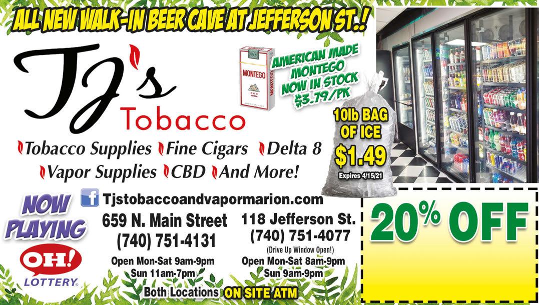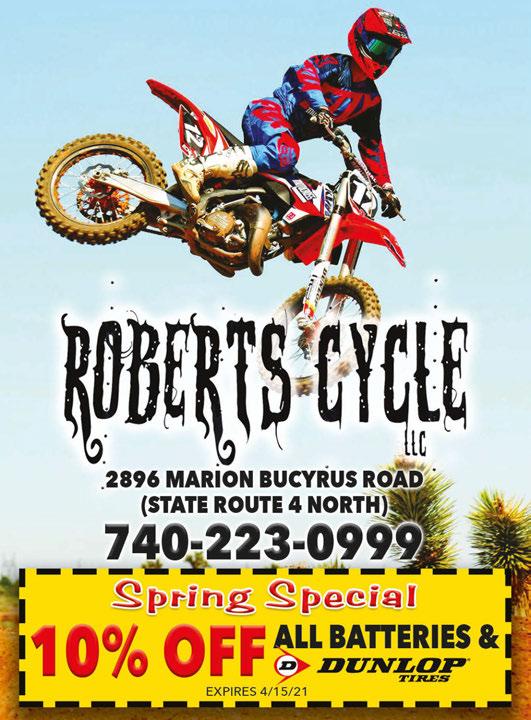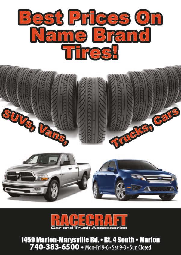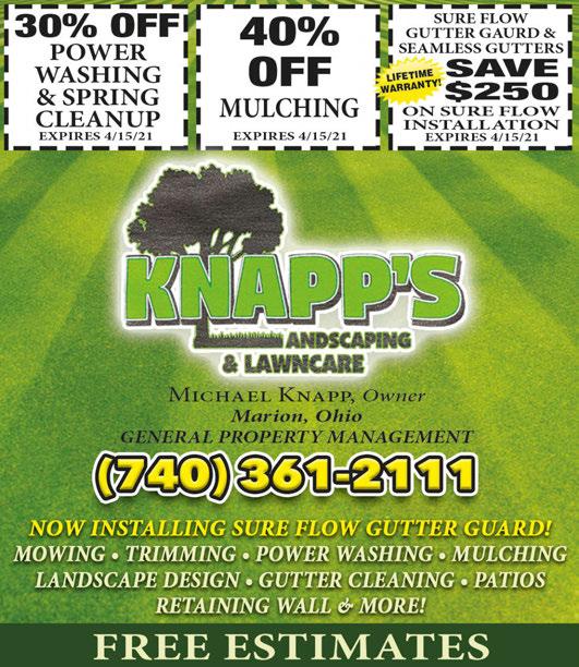 Not valid with other offers or insurance. Includes clear lenses and select frames. See store for details. Expires 4/15/21. $50 OFF Frame Not valid with other offers or insurance. Includes clear lenses and select frames. See store for details. Expires 4/15/21. FREE Blue Light Filter 541 E. CENTER STREET USED TIRES STARTING AROUND $30! FIRST RESPONDERS (Police, Fire & EMS) ACTIVE MILITARY $20 OFF SET OF TIRES + FREE TIRE DISPOSAL With coupon. Expires 4/15/21 Call or Text JT 740-272-0851 • 1775 Marion Waldo Rd., Marion, OH 43302 (Formerly the Loft) A Private Park & Pavilion benefiting Homeless to Home Animal Rescue & Cat Sanctuary A PERFECT PLACE for a UNIQUE OUTDOOR EVENT. Open air Pavilion, scenic waterfall, firepits, outdoor stage and in a beautiful wooded setting. Perfect for Graduations, Weddings & Receptions, Family Reunions and Special Events. Pricing will depend on month, day, time and how many people. We can accommodate 100+