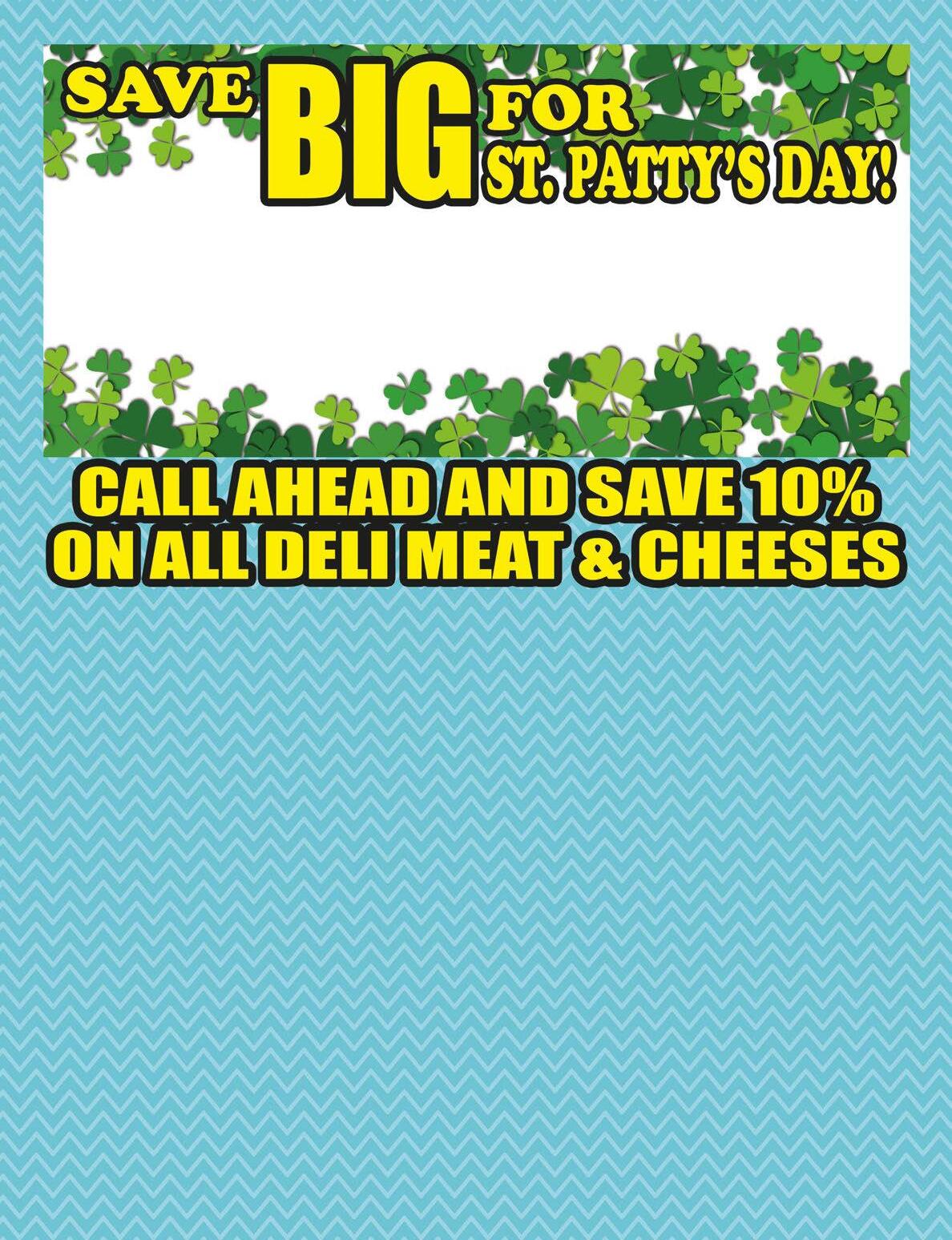Stay Warm & Dry. Use our drive thru for these Convenient pick up specials: Sunday through Thursday • 6” Italian, Ham or Turkey Sub $4.99 • Large Pepperoni $5.99 • Large 3 Item Pizza $6.99 • Italian Super Sub $6.99 • Large Chef Salad $6.99 Bologna $1.99/lb. Chipped Ham $3.49/lb. Buffet Ham $3.99/lb. Cooked Ham $2.99/lb. Swiss Cheese $4.99/lb. Hot Pepper Cheese $4.99/lb. Tavern Ham $3.99/lb.