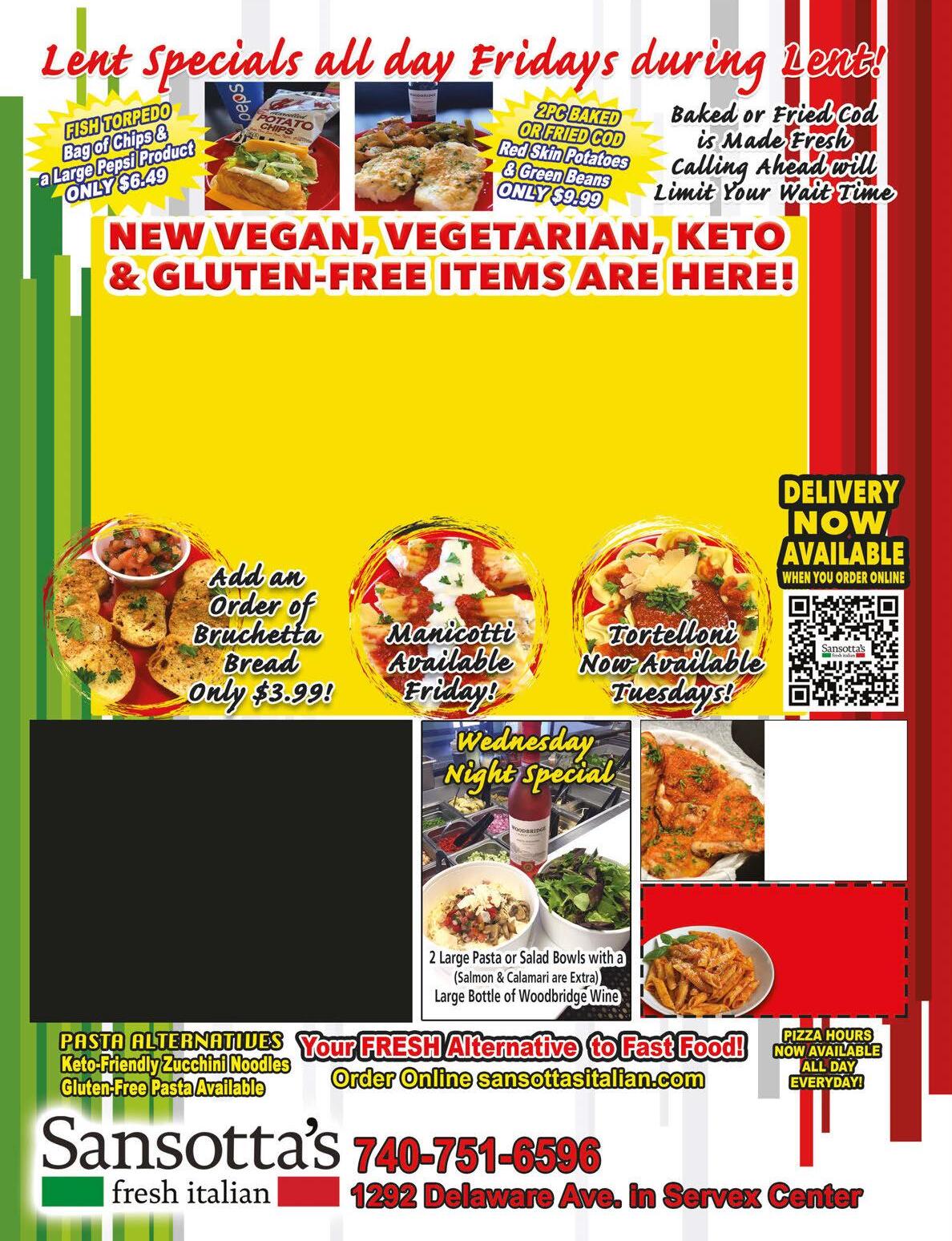 $1.00 OFF Any Pasta Bowl or Salad Must present coupon. Not valid with other offers. Expires 4/15/21. Daily Specials Monday Homemade Lasagna $925 Tuesday Philly Cheese Steak $850 Tortelloni-Organic Blend of Cheese $895 & Vegetables Thursday 4pc Family Recipe Italian Baked Chicken $499 (Breast, Thigh, Wing & Leg) Friday Manicotti $995 Saturday Ravioli 10pc ALL DAY $799 Pick Your Sauce, Pick Your Toppings Meat is Extra Fri./Sat. ALL DAY Bud & Bud Light $150 Fri./Sat./Sun. 14” Cheese Pizza $800 14” Toppings ea. $175 10” Cheese Pizza $600 10” Toppings ea. $125 Sunday Homemade Beef and Noodles over Mashed Potatoes PIZZA ALL DAY EVERYDAY! Gluten Free & Cauliflower Crust Now Available! WE CATER! facebook.com/SansottasItalian Sansottasfreshitalian@yahoo.com Catering Always Available Every Thursday is Family Recipe Italian Baked Chicken 4pc only $4.99 (breast, thigh, wing & leg) NEW 10” Vegan Pizza $12.00 Our famous pizza crust topped with tangy pizza sauce and vegan mozzarella. Cooked up golden brown. Additional toppings $1.25 each Vegan Vegetable Bowl $6.49 Cilantro lime riced cauliflower or zucchini noodles topped with our quick tomato sauce* and your choice of vegetables. Gluten Free Cheese Pizza $8.00 Cauliflower based gluten free crust with our famous pizza sauce and house cheese blend. Additional toppings $1.75 each We also offer a variety of keto friendly options using our salad menu and broad choices of vegetables. Gluten free pasta, cilantro lime riced cauliflower, or zucchini all available to substitute in any pasta bowl for additional $2.00 *We now use a blend of rice bran, extra virgin olive, avocado, and grapeseed oil to make our quick tomato sauce.