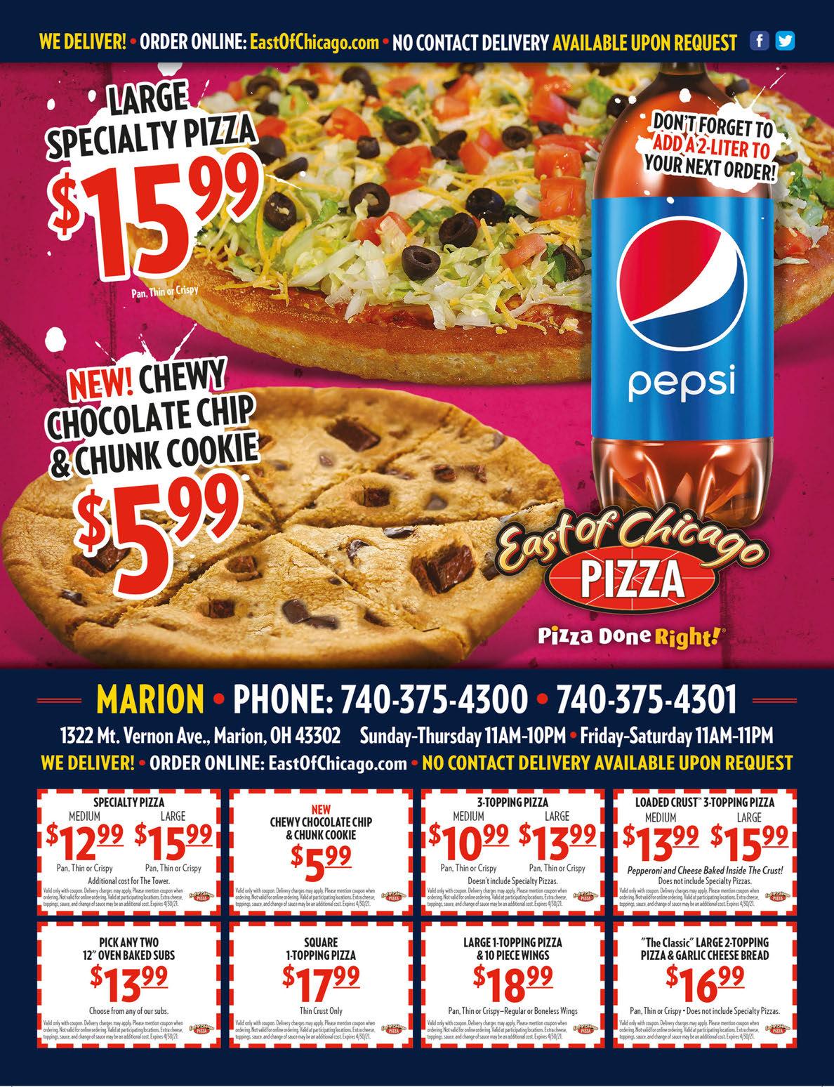 In Town Delivery $4 • Free In Town Delivery on Food Orders Over $30 Out Of Town Delivery Charge By Distance • Delivery Available 4pm-12am Monday - Sunday 2pm - Midnight • EVERYDAY BUY 2 SPECIALS! Dine-In • Carry-Out • Drive-Thru • 810 Davids Street • 740-383-2791 Monday - Sunday 2pm - Midnight 18” 1-Item Pizza Only $999 Must Present Coupon. Expires 4/15/21 60 Pc. Snack Bucket Chicken Fingers, Mushrooms, Onion Rings, Corn Dogs, Pepperoni Sticks, Mozzarella Sticks, Assorted Veggies $2199 or 30 Pc. $1399 Must Present Coupon. Expires 4/15/21 20 Pc. Walleye Bucket With French Fries, Breadsticks and Choice of Cole Slaw, Potato Salad, Baked Beans or Macaroni Salad Only $2499 Must Present Coupon. Expires 4/15/21 Super Sub Sale Your Choice: Pizza, Italian, Ham, Turkey 1 Only $799 2 Only $1399 Must Present Coupon. Expires 4/15/21 20 Boneless Chicken Wings Your Choice: Regular, BBQ or Hot Only $1399 10 Pc. $6.99 Must Present Coupon. Expires 4/15/21 Pizza Party Pack Giant 18” Pepperoni Pizza, 6 Chicken Wings (Your choice: hot, bbq or original) 6 Breadsticks (Choice of ranch dip or cocktail sauce) 1 lb of Potato Salad & Dessert Only $2899 Must Present Coupon. Expires 4/15/21 Lasagna or Spaghetti Dinner With Salad and Garlic Bread Only $699 Must Present Coupon. Expires 4/15/21 Super Special Large Pizza With Your Choice of 3 Toppings (excludes extra cheese) Only $799 Must Present Coupon. Expires 4/15/21 Large Deluxe Salads Your Choice Mix & Match Chef Loaded or Taco Loaded 1 Only $799 2 Only $1399 Must Present Coupon. Expires 4/15/21 2 Large Cheese Pizzas $10.99 10 Chars or Shredded Chicken or BBQ Pork or Sloppy Joe with Fries Only $1999 Must Present Coupon. Expires 4/15/21 We Accept In Store Only No Checks On Delivery 2 Large Cheese Pizzas w/1 Item $12.99 2 Large Cheese Pizzas w/2 Item $14.99 2 Large Five Item Deluxe Pizzas $18.99