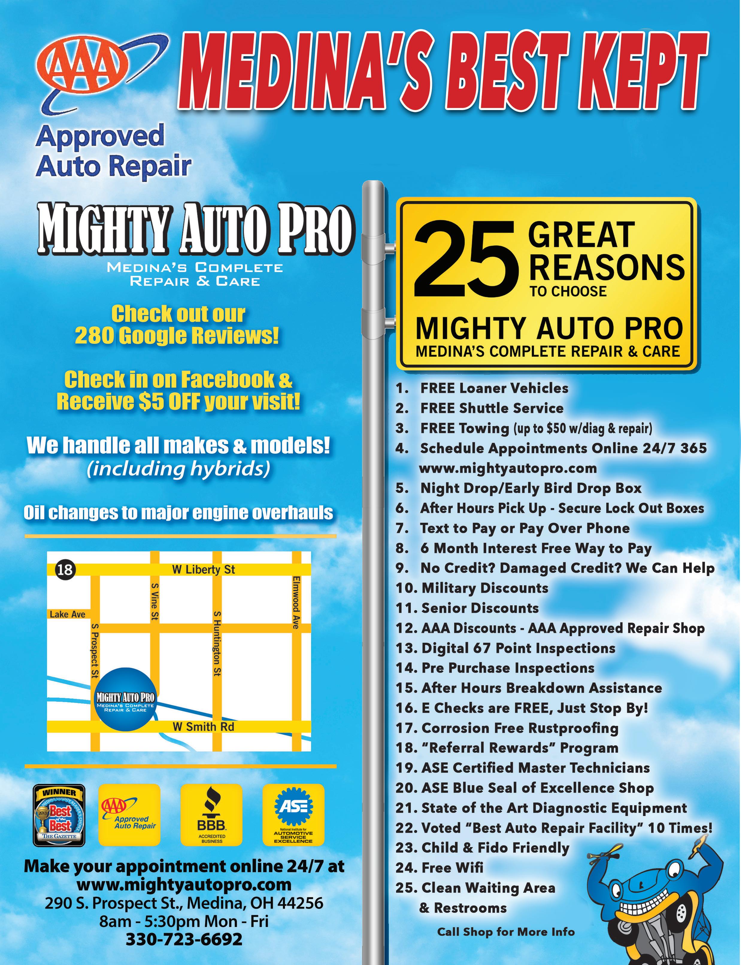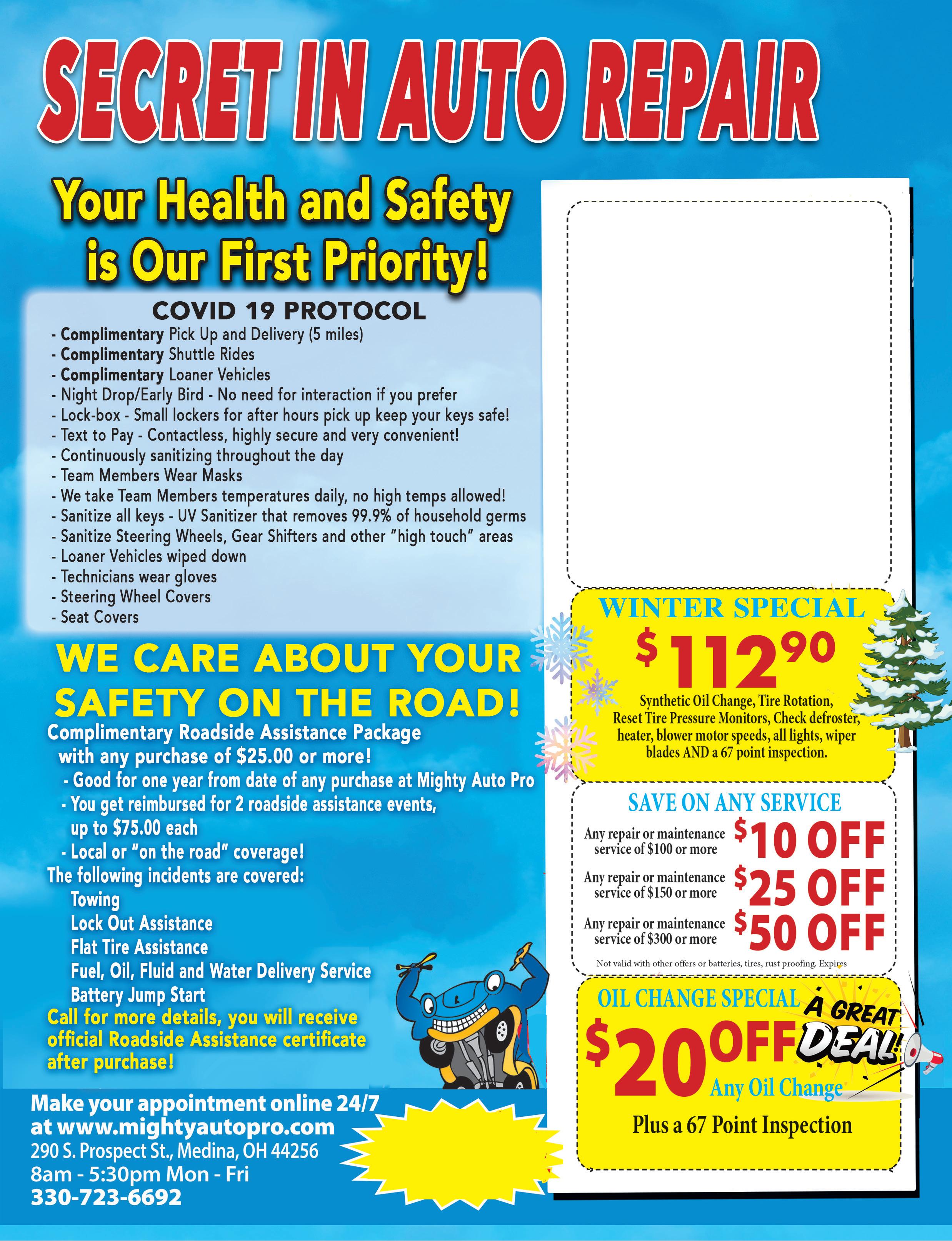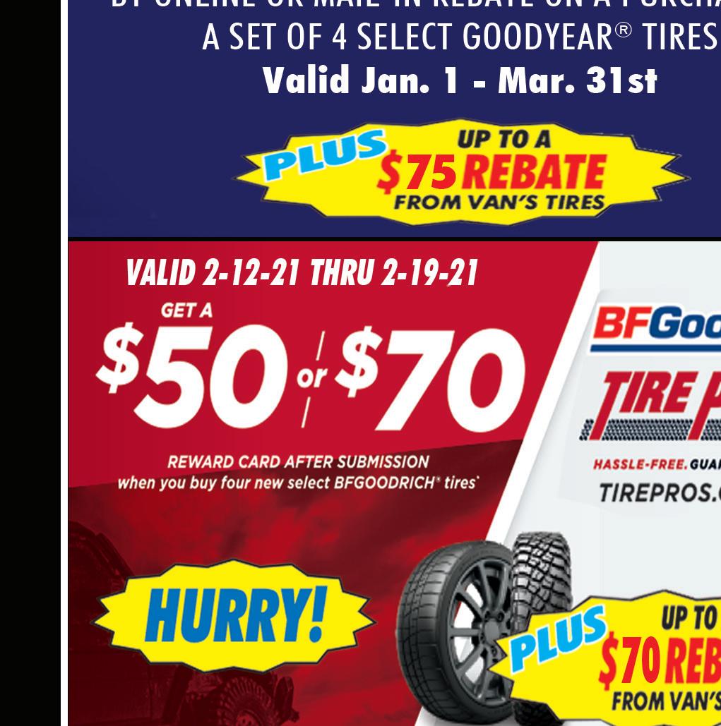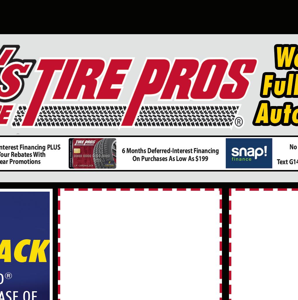 WADSWORTH 330-336-6630 185 Broad St | Wadsworth WATERLOO RD 449 E Waterloo Rd | ELLET 682 Canton Rd | Akron E. MARKET ST. 330-784-5454 1725 East Market St | Akron N. RIDGEVILLE 440-327-7010 37775 Center Ridge Rd | N Ridgeville MANSFIELD 801 Lexington Ave | IBERIA 3596 State Route 309 | MEDINA RD 330-239-2371 1451 Medina Rd | Plus Free Tire Rotation Selected vehicle may vary. (Up to 6 quarts) May not be combined with any other offer. No other discounts apply. See store for details. Expires 2-11-21 OIL CHANGE $40 OFF Per Axle Extra Savings - $100 on both Axels May not be combined with any other offer. No other discounts apply. See store for details. Expires 2-11-21 $6995 Cooling System Service Most vehicles. May not be combined with any other offer. Expires 2-11-21 COOLING SERVICE BRAKE SPECIAL SAVE 4 Tire Balance & 4 Wheel Alignment $7995 May not be combined with any other offer. No other discounts apply. See store for details. Expires 2-11-21 ALIGNMENT SPECIAL $20 OFF Any Flush • Brake Fluid Exchange • Power Steering Fluid Exchange • Engine Coolant Flush and Fill • Fuel System Service • Transmission Fluid Exchange Most vehicles. May not be combined with any other offer. Expires 2-11-21 FLUID FLUSH & EXCHANGE $40.00 Savings $20 OFF Battery & Installation May not be combined with any other offer. No other discounts apply. See store for details. Expires 2-11-21 BATTERY SPECIAL Save $10 on $100 Save $25 on $200 Save $50 on $400 Offer Not Valid on Tires May not be combined with any other offer. No other discounts apply. See store for details. Expires 2-11-21 SAVE ON REPAIRS FREE OIL CHANGE Up to 5 Quarts With a Purchase of 4 Tires and Alignment Minimum purchase of $450 before taxes and fees. Most vehicles. May not be combined with any other offer. Expires 2-11-21 OIL CHANGE SPECIAL $2495 REGULAR $29.95 $3495 $4995 REGULAR $59.95 TMS-M TMS-M TMS-M TMS-M TMS-M TMS-M TMS-M TMS-M