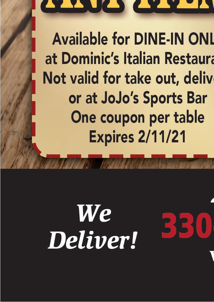 LUNCH: MON-THURS: 11AM-3PM MON-THURS: CLOSED 3PM-4:30PM ONLY DINNER: MON-THURS: 4:30PM-10PM • FRI & SAT: 11AM-11PM SUNDAY: 12 NOON - 9:30PM $5 OFF Your Total Purchase of $30 or More Not valid with Family Meals or any other offers or discount. Expires 2/11/21 DINING ROOM AND HIBACHI NOW OPEN Hibachi Family Meals To Go HIBACHI FAMILY MEAL FOR 4 $59.95 (1) Hibachi Steak (1) Hibachi Shrimp (2) Kids Hibachi Chicken Includes Edamame, Narumaki, Fried Rice, 2 Salads & 4 Soups HIBACHI FAMILY MEAL FOR 3 $49.95 (1) Hibachi Steak (1) Hibachi Chicken (1) Kid Hibachi Shrimp Includes Edamame, Fried Rice, 2 Salads & 3 Soups Gift Certificates Available Entire Menu Available for Carry Out All Day! DAYCARE PACKAGE $120 5 days of daycare for the price of 4 NAIL TRIM PACKAGE $50 6 nail trims for the price of 5 HALF PRICE DAYCARE PACKAGE $105 8 days of half price daycare days for the price of 7 (Mondays and Thursdays Only) Not to be used in conjunction with any other coupons or discounts. Expires 2/11/21. Not to be used in conjunction with any other coupons or discounts. Expires 2/11/21. Not to be used in conjunction with any other coupons or discounts. Expires 2/11/21. For advertising information, call 330-350-3141 NEXT ISSUE IN HOMES: February 11, 2021 ADVERTISING DEADLINE: January 29, 2021