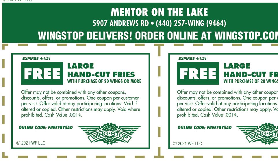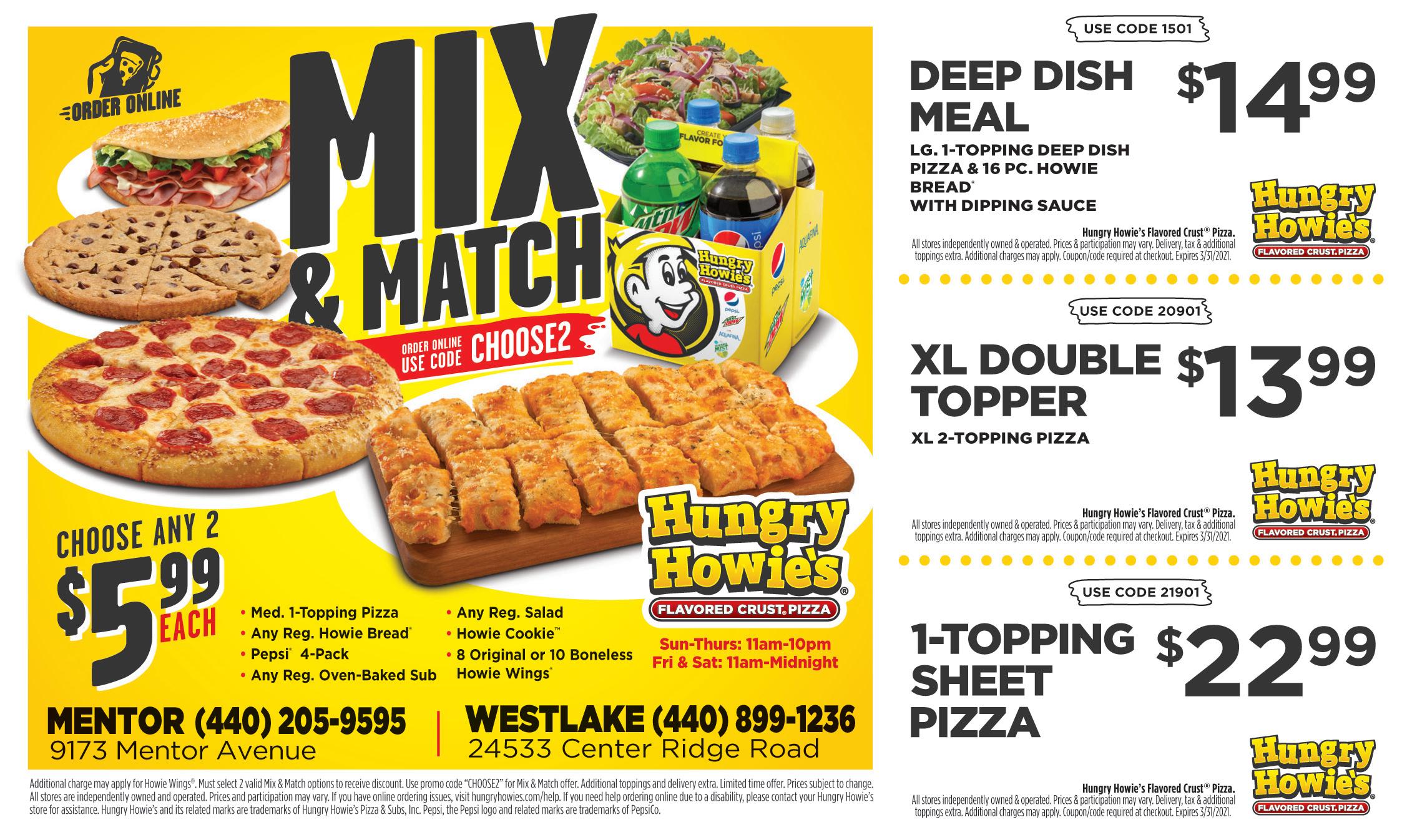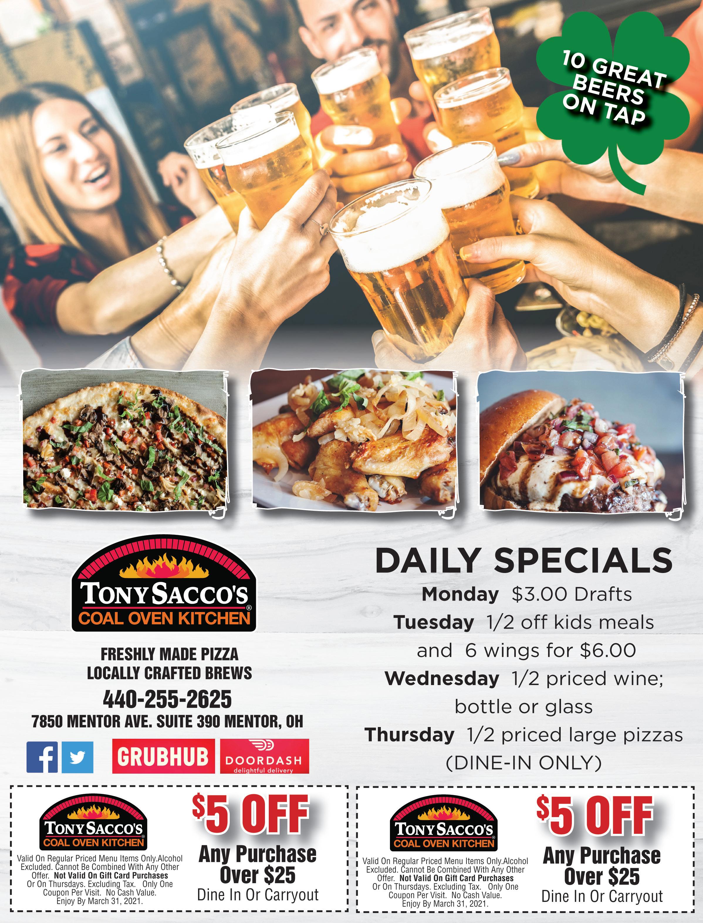 “PASTA FOR PUPPIES!” HAS BEEN RESCHEDULED FOR MONDAY, APRIL 12, 2021. BRING YOUR 2020 TICKET. CALL LINDE AT 440-951-2468 FOR MORE INFORMATION. Mon: 4-9p • Tues-Thurs: 11a-10p • Fri: 11a-Midnight • Sat: 11a-11p Sun: 1-9p 7875 MUNSON ROAD • Mentor-on-the-Lake 440-209-1491 Mastercard VISA TAKE-OUT & DELIVERY • MINIMUM $10 ORDER FOR DELIVERY EVERYDAY FAMILY SPECIALS 18” XL One Topping Pizza, Appetizer, Large Dinner Salad & 2-Liter Soda $24 Spaghetti with 8 Meatballs, 8 pcs. Garlic Bread & Large Dinner Salad $22 CATERING AVAILABLE Classic Italian Cuisine Classic Italian Cuisine FAMILY OWNED & OPERATED D A I L Y S P E C I A L S MON: 16” One topping Pizza $9.99 TUES: Two-Topping Calzones $5.00 WED: BOGO Pepperoni Roll (reg. $6.99) THUR: Two 12” Subs $10 (certain restrictions) See our complete menu! www.TheZaShop.com Two 16” Large One Topping Pizzas $22 $1695 $500 OFF Any Order of $20 or more at regular menu price with 6 Veggie Toppings! ANGIE’S PIZZERIA • 440-209-1491 One Coupon Per Customer. Not valid with any other offers or promotions. Cannot be combined with any other offer. Expires 4-1-21 ANGIE’S PIZZERIA • 440-209-1491 One Coupon Per Customer. Not valid with any other offers or promotions. Cannot be combined with any other offer. Expires 4-1-21 ANGIE’S PIZZERIA • 440-209-1491 One Coupon Per Customer. Not valid with any other offers or promotions. Cannot be combined with any other offer. Expires 4-1-21 ANGIE’S PIZZERIA • 440-209-1491 One Coupon Per Customer. Not valid with any other offers or promotions. Cannot be combined with any other offer. Expires 4-1-21 18” XL Two Topping Pizza, & 2-Liter Soda Lent Special $1299 Large 16” Veggie Delight Pizza SAVE $3.00 St. Patrick's Day Homemade Dinners! Corned Beef, Cabbage, Red Skin Potatoes & Baby Carrots Jumbo Corned Beef, Pastrami & Reubans Sandwiches www.MentorFamilyRestaurant.com Check out our ratings from the Health District at www.healthspace.com/Clients/Ohio/Lake/Lake_Web_Live.nsf WE ACCEPT ANY COMPETITORS CURRENT COUPONS CLASSIC BREAKFAST & CRISP SALAD BAR 6888 CENTER STREET • MENTOR • 440-255-8810 ON 615 AT TYLER BLVD. Check out our reviews on Google! EARLY BIRD SPECIALS ONLY $5.99 • 8 CHOICES TUES.- FRI. 2-5PM WE SERVE BRUNCH DAILY! Buy One Breakfast, Lunch or Dinner and 2 Beverages, at menu price, get the Second Breakfast, Lunch or Dinner of equal or lesser value FREE! FREE MEAL! Breakfast ($4 Max. Discount) Lunch ($5 Max. Discount) Dinner ($6 Max. Discount) DINE-IN ONLY Cannot combine with other offers, specials or discounted items. Expires 4-1-21 PLEASE PRESENT COUPON TO SERVER AT TIME OF ORDERING DINE-IN ONLY Cannot combine with other offers, specials or discounted items. Expires 4-1-21 PLEASE PRESENT COUPON TO SERVER AT TIME OF ORDERING $5 OFF Any Purchase of $30 or more. $4 OFF Any Purchase of $25 or more. $3 OFF Any Purchase of $15 or more. $2 OFF Any Purchase of $10 or more. DAILY DINNER SPECIALS; Tuesday;
