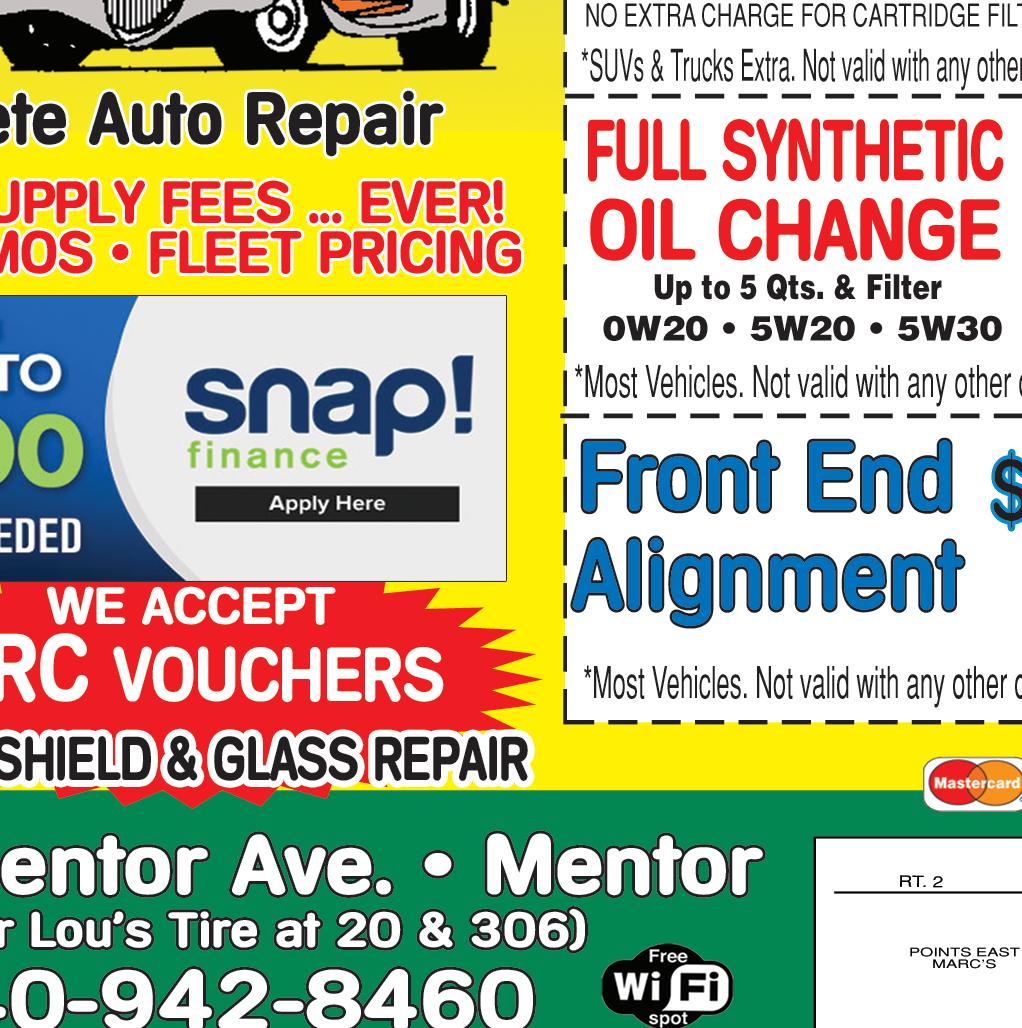SHOP LOCALLY $$$ SAVE LOCALLY™ • VISIT www.TownMoneySaver.com FOR MORE COUPON SAVINGS! 7488 Mentor Avenue Mentor • 440-946-3995 4839 Robinhood Dr. Willoughby • 440-946-9393 Mon-Sat: 10:30am - 9pm / Sunday 11am - 8pm Mon-Thur: 10:30am-9pm / Fri & Sat: 10:30am-10pm / Sunday 11am - 8pm FAMILY PACK NO LIMIT! NO LIMIT! NO LIMIT! Sunday Only! Extra for BTE. Valid only at 7488 Mentor Ave. & 4839 Robinhood Dr. Not valid with any other offers, online ordering or delivery. EXPIRES 9-30-20 Any 10” Sandwich $4.75 Any 7” Sandwich $18 Any 4 7” Sandwiches $6.75 4- Sandwiches 4- Reg. Potato Waffers® 2- Liter of Pepsi® 7” .......$28.99 +tax 10” .....$32.99 +tax NO LIMIT! NO LIMIT! NO LIMIT! Extra for BTE. Valid only at 7488 Mentor Ave. & 4839 Robinhood Dr. Not valid with any other offers, online ordering or delivery. EXPIRES 9-30-20 Extra for BTE. Valid only at 7488 Mentor Ave. & 4839 Robinhood Dr. Not valid with any other offers, online ordering or delivery. EXPIRES 9-30-20 Extra for BTE. Valid only at 7488 Mentor Ave. & 4839 Robinhood Dr. Not valid with any other offers, online ordering or delivery. EXPIRES 9-30-20 Extra for BTE. Valid only at 7488 Mentor Ave. & 4839 Robinhood Dr. Not valid with any other offers, online ordering or delivery. EXPIRES 9-30-20 NO LIMIT! Any 7” Meal Extra for BTE. Valid only at 7488 Mentor Ave. & 4839 Robinhood Dr. Not valid with any other offers, online ordering or delivery. EXPIRES 9-30-20 $6.99 7” Romanburger® OR 7” Hot Buttered Cheesesteak™ $4.25 MAKE IT A MEAL FOR JUST $2.90 + tax MORE! +tax MAKE IT A MEAL FOR JUST $2.90 + tax MORE! MAKE IT A MEAL FOR JUST $2.90 + tax MORE! Online ordering: mrhero.com 440-283-WASH (9274) Mastercard VISA • Non-Pressure Roof Washing • House Washing • Deck Staining WetJetPressureWashing.com Your Deck Professionals! TODAY! LET US DO YOUR $50 OFF COMPLETE HOUSE WASH We Use Eco Friendly Detergent, Hot & Cold Water, High & Low Pressure Wash Process Removes Mold, Mildew & Algae & Makes Your House Look New Again! Not valid with any other offer. Expires 10-31-2020 Must be complete roof. Not valid with any other offer. Expires 10-31-2020 Includes no-pressure soft-wash method. Removal of unsighlty black mold stains. Will Not Harm Shingles! $75 OFF ROOF CLEANING Wash with Eco Friendly Detergent INCLUDES ONE COAT OF PROFESSIONAL GRADE DECK STAIN OR SEALANT $100 OFF DECK STAINING/SEALING Not valid with any otheroffer. Expires 10-31-2020 $50 OFF We Throughly Clean Your Concrete and Apply One Coat of Professional Grade Concrete Sealer. Call for Details. Not valid with any other offer. Call for Detials. Expires 10-31-2020 CONCRETE WASH & SEAL PACKAGE PROTECT YOUR CONCRETE FOR WINTER!
