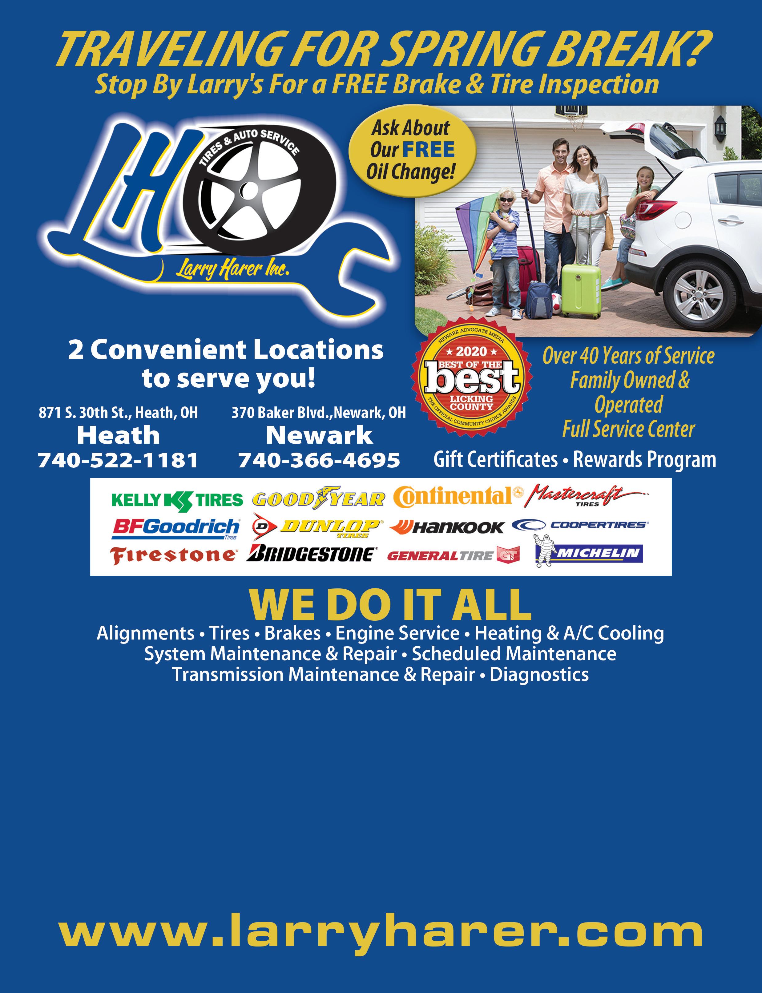 NEWARK • HEATH To advertise, call 614-679-8160 Shop locally. Shop safely. Support LOCAL businesses! March 2021 Local people serving local people • All work done by owners • All E-File Products Available • Small fees = bigger refunds • Ask us about “no up-front fees” CALL 740-349-8220 Diana Robinson • Paul Brasseur • Sally Shipley 47 W. National Drive, Newark, OH 43055 (Over 19 years at this location) Over 98 Years Combined Experience LOW FEES! FAST, FRIENDLY SERVICE! We honor ALL phone price quotes Walk-ins & drop-offs welcome! 34 South 2nd Street, Newark, OH 43055 South of Wendy’s, Just off the Square (740) 345-9656 moundcitytire@yahoo.com www.moundcitytire.com OIL CHANGE $24.95 Add’l $1.50 oil disposal surcharge (up to 5 quarts conventional oil) Includes FREE Tire Rotation. Must present coupon. Expires 4/1/21. SPRING PACKAGE (Up to 5 quarts conventional oil) Must present coupon. Expires 4/1/21. $49.95 INCLUDES: Oil Change • Tire Rotation Regular Wiper Blades • Alignment, Antifreeze, Battery & Belt Checks Bud Kvintus - Manager Eric Van Houten - Owner 752 Hebron Rd Heath OH • 740-522-6263 (Located across the street from Turkey Hill Gas Station) Family Owned & Operated Must present coupon. Not valid with any other discounts or special. Expires 4/1/21. $1.00 OFF Super Wash Must present coupon. Not valid with any other discounts or special. Expires 4/1/21. $2.00 OFF Ultimate Wash Monthly Car Wash Packages Starting at $19.99 A Month New State of the Art Equipment We Have FREE Vacuums Vacuums Keep The Salt O This Winter With Our MONTHLY Passes!