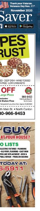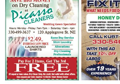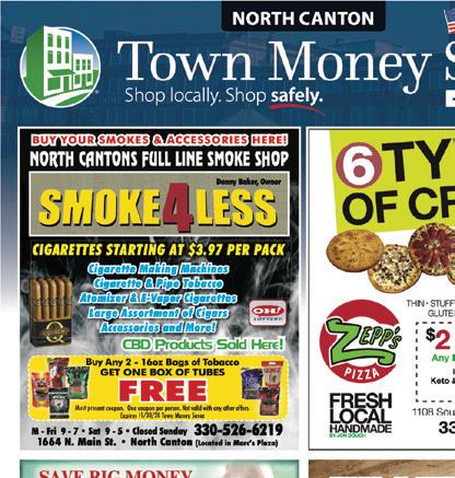 NORTH CANTON December 2020 Shop locally. Shop safely. Support LOCAL businesses! M - Fri 9 - 7 • Sat 9 - 5 • Closed Sunday 330-526-6219 1664 N. Main St. • North Canton (Located in Marcʼs Plaza) NORTH CANTONS FULL LINE SMOKE SHOP CBD Products Sold Here! Buy Any 2 - 16oz Bags of Tobacco GET ONE BOX OF TUBES FREE Must present coupon. One coupon per person. Not valid with any other offers. Expires 3/1/20. Town Money Saver BUY YOUR SMOKES & ACCESSORIES HERE! Denny Baker, Owner CIGARETTES STARTING AT $3.97 PER PACK Cigarette Making Machines Cigarette & Pipe Tobacco Atomizer & E-Vapor Cigarettes Large Assortment of Cigars Accessories and More! 12/31/20 Wedding Gown Same Day Service Shirt Laundry Alterations Dry Cleaning Professionals $2.49ea. EVERYDAY LOW PRICE LAUNDERED SHIRTS Hours: Monday - Friday: 7am-7pm • Saturday 10am - 4pm 330-499-3637 • 120 Applegrove St. NE Picasso CLEANERS Of equal or less value. Dry Clean Only. No Limit. Not valid with other offers. One coupon per visit. Expires 12/31/20. Town Money Saver Pay For 2 Items, Get The 3rd FREE SAVE BIG MONEY on Dry Cleaning at 966-945 THIN • STUFFED • DEEP DISH • HAND-TOSSED GLUTEN FREE • LOW CARB KETO 6” 2 Sub 9 24 1 14” 1 Super Family 2 2 Sub 9 24 Wing 16 14” Pizz 12 966-9453 1108 South Main St. North Canton Includes: Keto & Gluten Free Any Large Pizza $ 2 OFF FIX IT GUY CALL KURT TODAY AT: 330-546-5911 WHAT NEEDS FIXED AT YOUR HOUSE? HONEY DO LISTS GARBAGE DISPOSAL • DISHWASHER • ELECTRIC FIXTURES • PLUMBING FIXTURES • VANITIES • TOILETS • SINKS • OLD VINYL FLOORING • CAST IRON PIPE REPLACEMENT • GALVANIZED WATER LINE REPLACEMENT • DECK & DOOR REPAIR • CONCRETE REPAIR • DRYWALL REPAIR • PROBLEM SOLVING OVER 19 YEARS EXPERIENCE WITH THIS AD TAKE 10% OFF LABOR