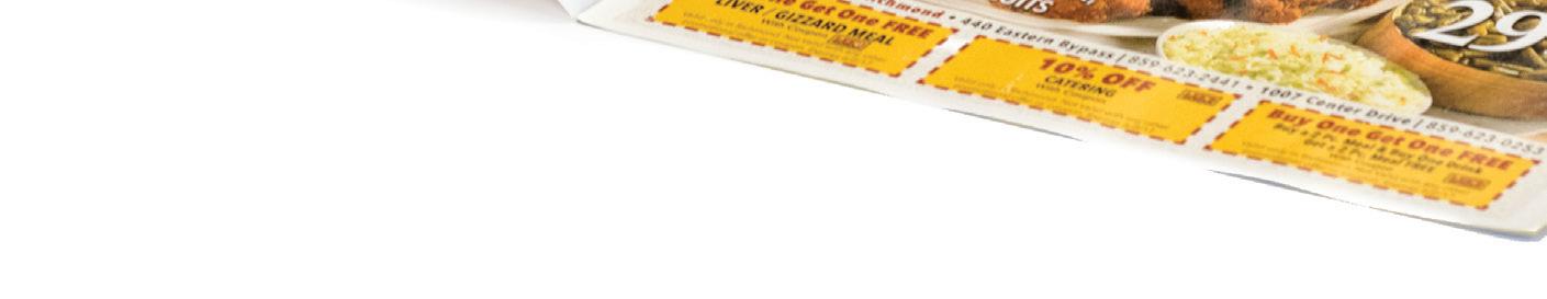 330-492-2222 2692 Easton St. NE Plain Twp./N. Canton (Located in Oakwood Square) ONLINE ORDERING! OrderOnlineFromOurAwardWinningMenu! DeliveryorTakeOut.Visit: www.gioninos.com Sunday - Thursday 10:30am-9pm Friday & Saturday 10:30am-10pm Delivery Available - $10 Minimum Order GIONINO’S PIZZERIA - Additional items $2.00, extra cheese $3.20. Coupon expires 2-25-21. Not valid with any other offer. Valid only at North Canton location. TMS GIONINO’S PIZZERIA - Additional items $1.60, extra cheese $2.75. Coupon expires 2-25-21. Not valid with any other offer. Valid only at North Canton location. TMS 1 Large 16” 2-Item Pizza Only $1295 ONLINE: TMS2 2 Large 16” 2-Item Pizzas Only $2795 ONLINE: TMS3 1 Medium 12” 2-Item Pizza & Order of Jumbo Buffalo Wings Only $1995 ONLINE: TMS1 2 Medium 12” 2-Item Pizzas Only $1995 ONLINE: TMS5 GIONINO’S PIZZERIA - Additional items $1.60, extra cheese $2.75. Coupon expires 2-25-21. Not valid with any other offer. Valid only at North Canton location. TMS GIONINO’S PIZZERIA - Additional items $1.60, extra cheese $2.75. Coupon expires 2-25-21. Not valid with any other offer. Valid only at North Canton location. TMS 1 Medium 12” 3-Item Pizza Only $1095 ONLINE: TMS4 GIONINO’S PIZZERIA - Additional items $2.00, extra cheese $3.20. Coupon expires 2-25-21. Not valid with any other offer. Valid only at North Canton location. TMS GIONINO’S PIZZERIA - Additional items $2.00, extra cheese $3.20. Coupon expires 2-25-21. Not valid with any other offer. Valid only at North Canton location. TMS 1 Large 16” 1-Item Pizza & Order of Jumbo Buffalo Wings Only $2395 ONLINE: TMS6 Gionino’s Buckeye Wings 12 Bone in Wings Only $1295 8 Years In A Row! NEW Chocolate Chunk C kie Pie Separate from the pack. TMS postcards mail individually and are printed on heavier cardstock with a glossy nish. Price includes professional graphic design, high-quality printing, glossy UV coating, and mailing via USPS. Make an impact with direct-mail postcards. Local advertising made easy. Contact Kevin. 330.280.2180 kevinprovance@townmoneysaver.com Choose from 4 di erent sizes Several targeting options BASIC – Mail to every address* SMART – Mail to speci c addresses using demographic information EXACT – Mail to your own address list *Mail to an entire TMS market for the best value – limited availability. AS LOW AS 18¢ PER ADDRESS*
