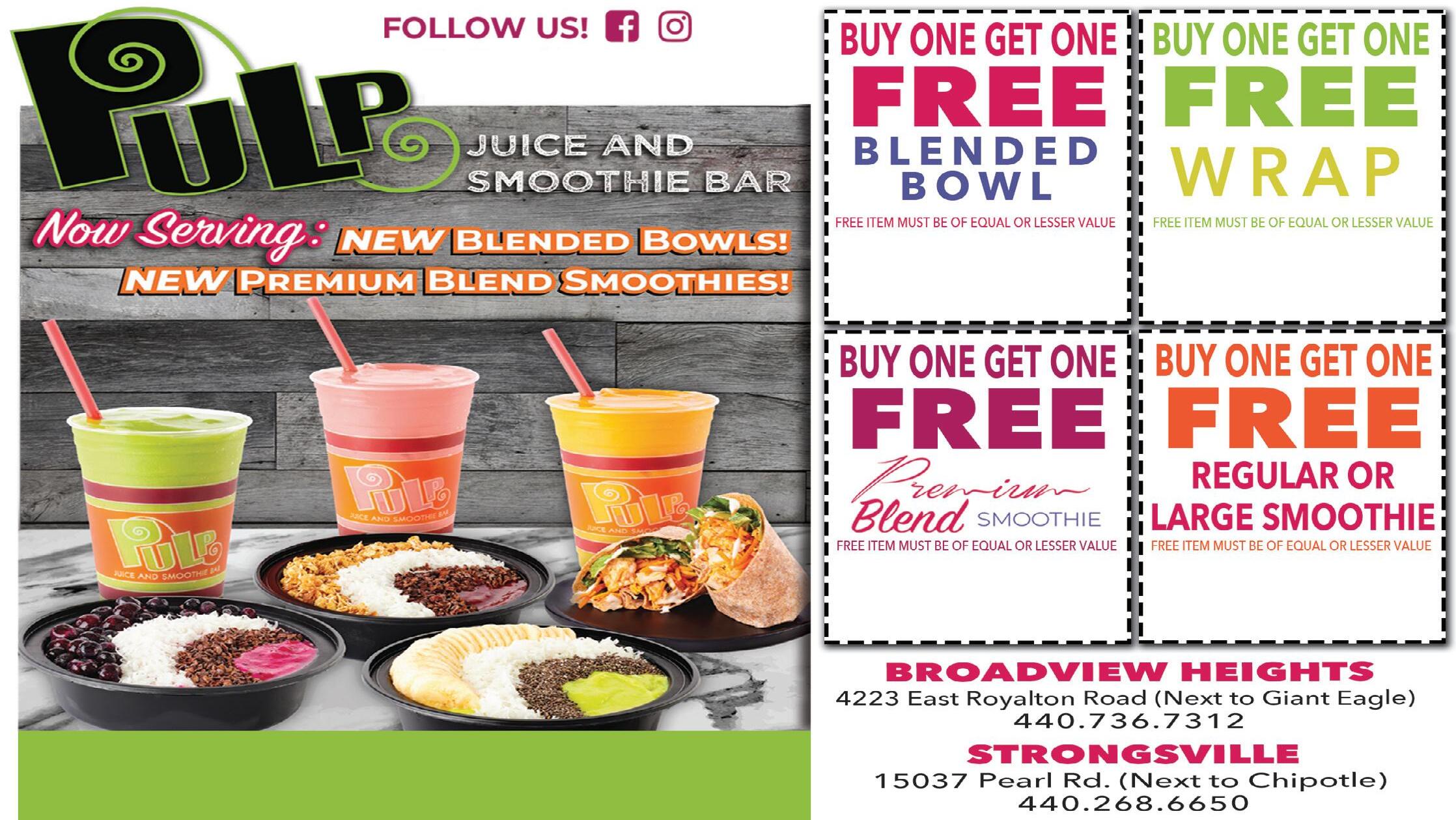 NORTH ROYALTON February 2021 Shop locally. Save locally. PULPJUICEANDSMOOTHIE.COM Smoothies, Healthy Wraps, Salads, Fresh Fruit and Vegetable Juice, Nutritious Wheatgrass! Valid at Broadview Heights & Strongsville location only. One coupon per customer per visit. Offers cannot be combined. Must present coupon at time of purchase. Expires 2-28-2021 Valid at Broadview Heights & Strongsville location only. One coupon per customer per visit. Offers cannot be combined. Must present coupon at time of purchase. Expires 2-28-2021 Not valid on Premium Smoothies. Valid at Broadview Heights & Strongsville location only. One coupon per customer per visit. Offers cannot be combined. Must present coupon at time of purchase. Expires 2-28-2021 Valid at Broadview Heights & Strongsville location only. One coupon per customer per visit. Offers cannot be combined. Must present coupon at time of purchase. Expires 2-28-2021 1 Medium 3-Toppings Pizza $1099 PROMO CODE MD1099 PROMO CODE XL1499 $1499 PROMO CODE PIZZA30 Any Pizza Order Valid with coupon. Not valid with any other offer. LIMITED TIME OFFER. Valid with coupon. Not valid with any other offer. LIMITED TIME OFFER. Valid with coupon. Not valid with any other offer. LIMITED TIME OFFER. Valid with coupon. Not valid with any other offer. LIMITED TIME OFFER. 30% OFF 6701 Royalton Rd. NORTH ROYALTON 440-230-1200 Online Ordering XLarge 3-Toppings Pizza 2 Large 2-Toppings Pizzas PROMO CODE 2LG20 $20 ONLINE ONLY Valid with coupon. Not valid with any other offer. LIMITED TIME OFFER. Valid with coupon. Not valid with any other offer. LIMITED TIME OFFER. Large Epic Stuffed Crust 1-Topping Pizza $12 PROMO CODE STUFFED Heart-Shaped 1-Topping Pizza & a Brownie $16 PROMO CODE BEMINE