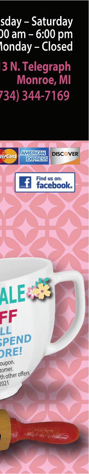 $1000 OFF Quick Drain Walk-In Tub $750 OFF Full Tub/ Shower System Toledo’s #1 Ranked Bathroom NO SPRING HOME SHOW SPECIALS If you are calling “1-800” you are paying too much! • Lifetime Warranty • Financing Available FREE Estimates! 4519 Bennett Rd. 419-470-8821 2 TOLEDO AREA SHOWROOMS Visit us to view our many options! NEW LOCATION 2503 N. Reynolds Rd. Just north of Bancroft 419-389-9950 WWW.TOLEDONEWBATH.COM Keeping Seniors Safe & In Their Homes Longer... Is More Important Now Than Ever With COVID-19! HomeSpringShow Cancelled NeverCancelledBefore Discounts!! With TMS coupon. Some restrictions apply. Exp. 4/30/21 With TMS coupon. Some restrictions apply. Exp. 4/30/21 vinyl plank carpet laminate wood vinyl REMNANTS & ROLL ENDS .99¢ sq. ft. Proudly Offering Military/Veteran Discounts 8190 LEWIS AVE. 734.847.1198 Corner of Lewis & Dean, Temperance www.cartercarpet.com Professional Installation you can trust. Locally owned & operated for over 34 years. 12 Months Same As Cash! ank You For Your Service! CARPET .99¢ - $2.29 sq. ft. Several In Stock Colors & Styles To Choose From LAMINATE $2.99 sq. ft. Several Colors To Choose From LVP Luxury Vinyl Plank $2.99 sq. ft. Several Colors To Choose From 10% OFF MATERIAL HOURS: Mon-Thurs 10-5 Fri 10-4 • Sat 10-2 With TMS coupon. Not valid with other offers. Exp. 4/30/21 With TMS coupon. Not valid with other offers. Exp. 4/30/21 MATERIAL ONLY. Offer does not apply to in-stock material or previously placed orders. With TMS coupon. Not valid with other offers. Exp. 4/30/21 With TMS coupon. Not valid with other offers. Exp. 4/30/21