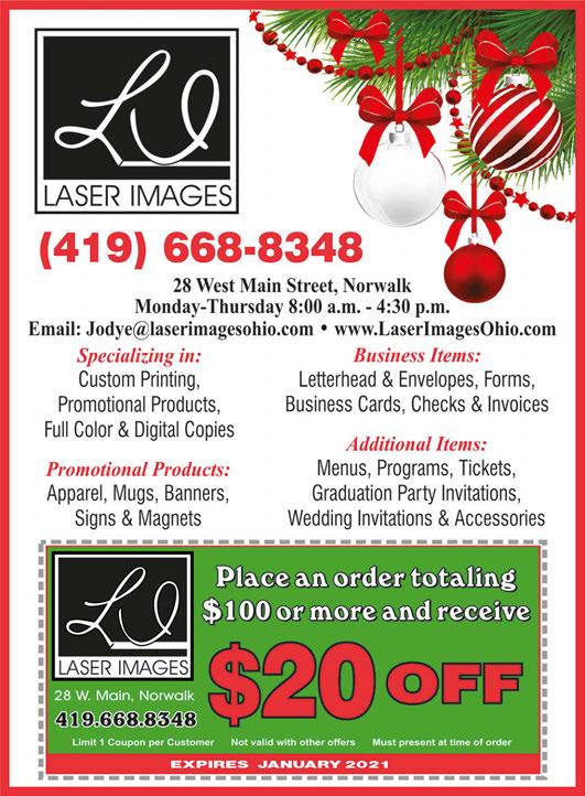 TRANSMISSION TROUBLES? WE DO ASE WORK ON: Transmissions Engine Repair Suspensions & Steering Brakes Electrical/Electronic Systems Heating & Air Conditioning Engine Performance • Automatic • Standard • Domestic & Foreign • Repair • Recondition Lyle R. Fisher, Jr. President 15 Old State Rd. Norwalk 419/668-5725 John 3:16 Excluding engine oil change. With coupon only. Not valid with other discounts or offers. Expires 01-07-21. $35 OFF any Work or Service Wishing you and yours a blessed holiday season MG Carpet Cleaning Locally Owned & Operated • Boat and car upholstery cleaning • We clean fabrics others can’t! • Product safe and non-toxic • Non-flammable, biodegradable • No sticky, oily residue to cause rapid resoiling • Carpet dry in approx. 1 hour • Carpet left soft and clean FREE CARPET DEODORIZER SERVING HURON, OTTAWA, ERIE, & SANDUSKY COUNTIES With any fall carpet cleaning special. Stairs are not considered a room. Coupon required. Expires 01-07-21. Areas over 250 sq. ft. are considered separate areas. Stairs are not considered room. Coupon required. Expires 01-07-21. FREE Kitchen Vinyl Floor Cleaning WINTER SPECIAL Any 3 Rooms Any 4 Rooms WE DO COMPLETE CAR DETAILING! FACT WEARE BETTER, AND E ARE HERE ’SWHY: The owner of our company will come to your house and clean your carpets. Carpets are clean and dry in 15-60 minutes. No overwetting, which can foster microbial growth and attract new dirt instantly. 567.228.7533 CALL US FOR SNOW PLOWING! $89 $99 N N