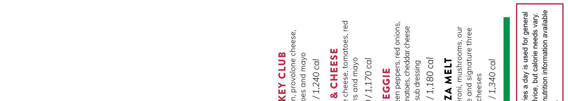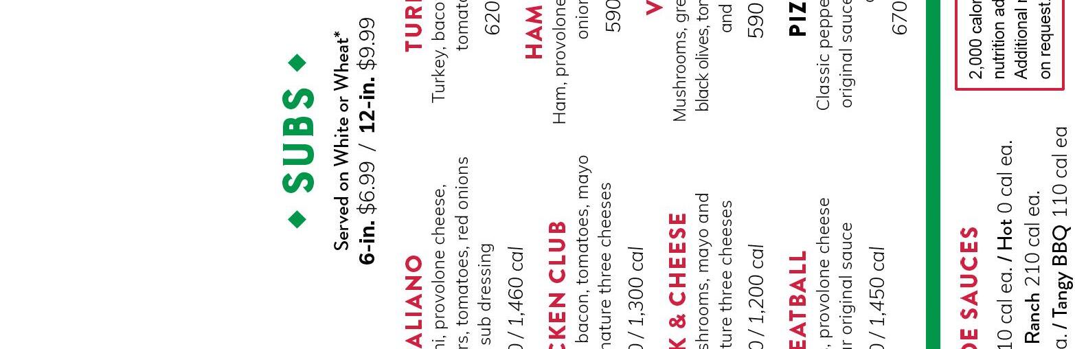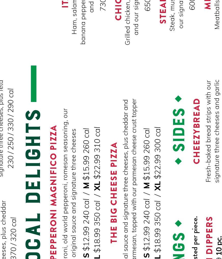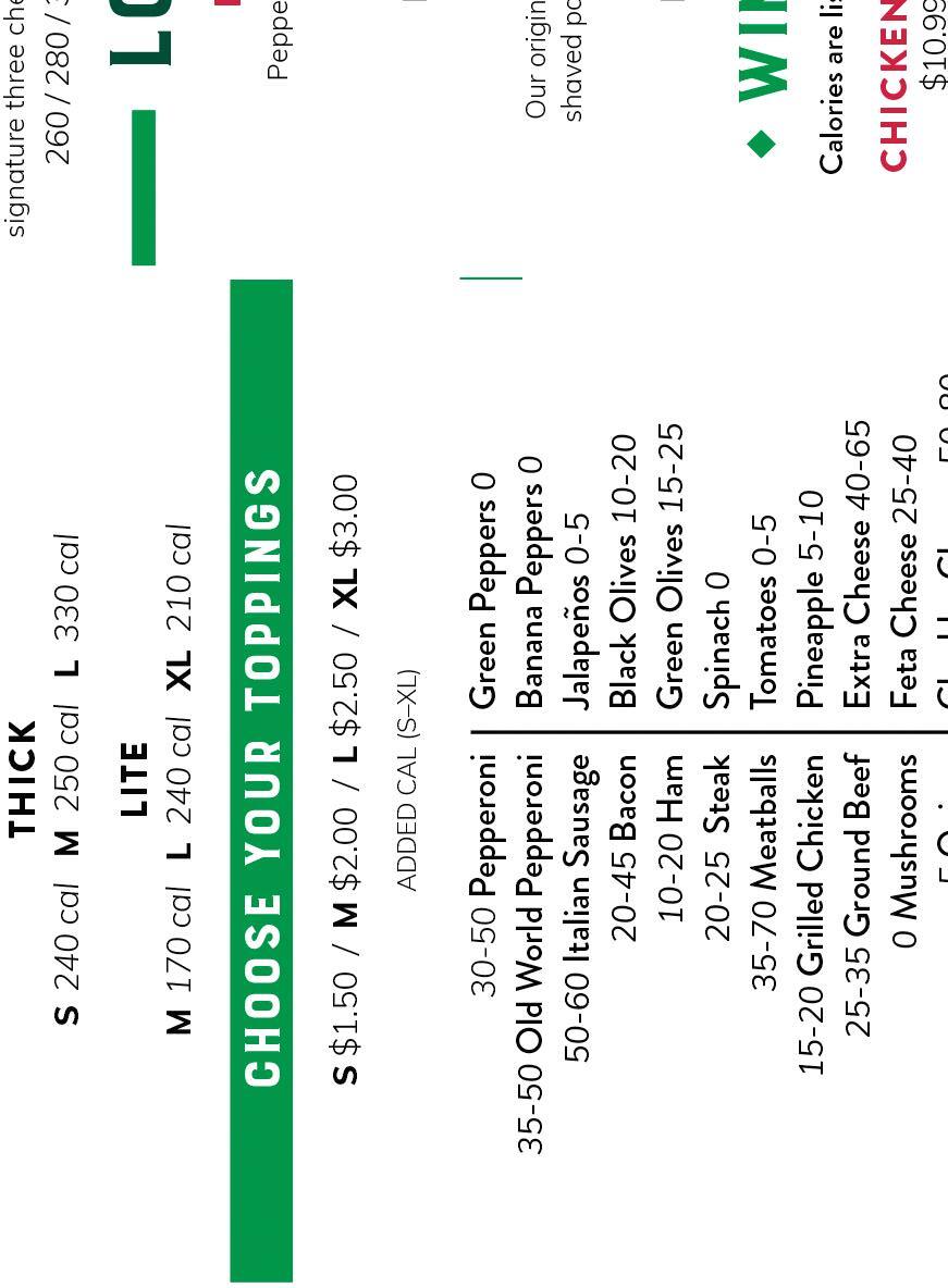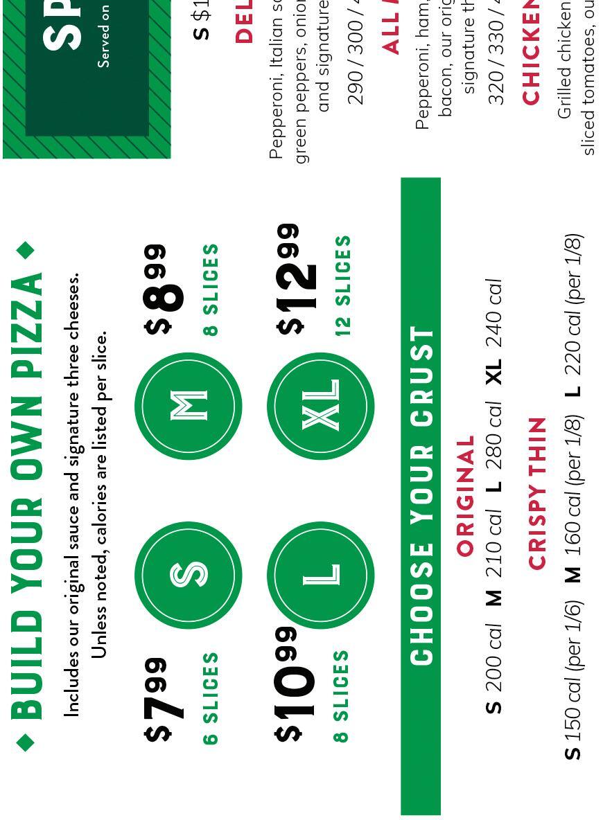 6, 9, 15, & 20 Pieces S / M / L / XL S 240 cal / M 260 cal / L 350 cal / XL 310 cal S 240 cal / M 260 cal / L 350 cal / XL 300 cal 10 or 15 pieces 6-in. or 12-in.