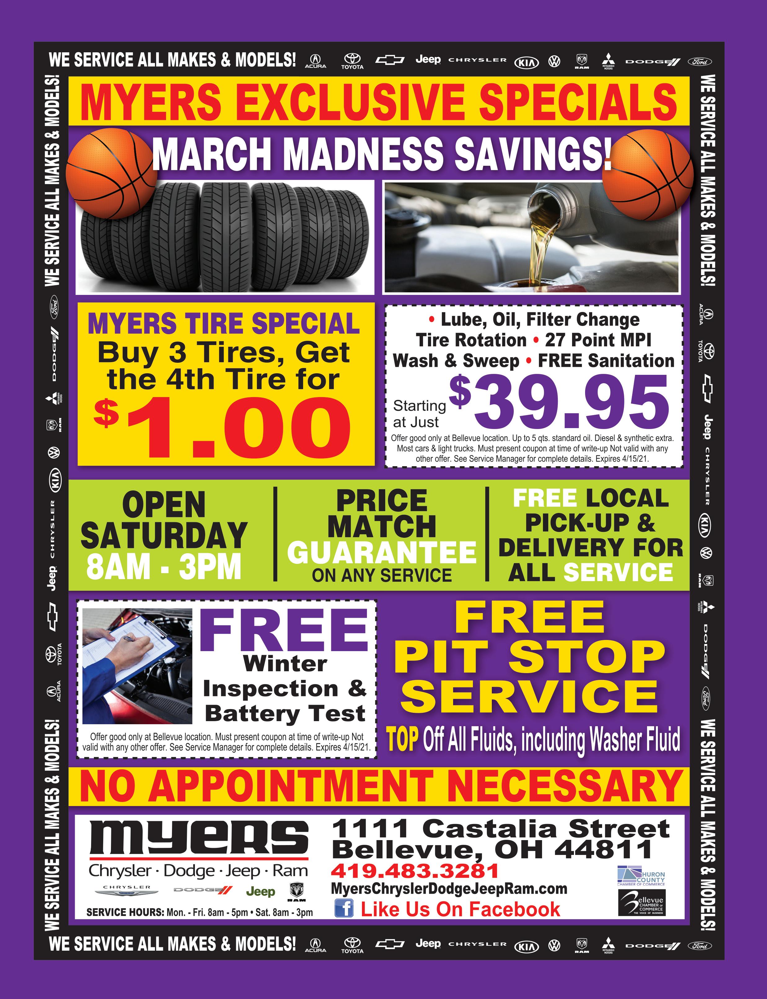 Mon-Fri 8am-5:30pm • Saturday 8am-Noon • CALL 419-502-5342 AUTO GROUP CHRYSLER DODGE JEEP RAM FIRELANDS AUTO GROUP • 2206 CLEVELAND RD. • SANDUSKY At Firelands Chrysler Dodge Jeep Ram, we do more than work on vehicles...we help PEOPLE. How may we help YOU today? We Service All Makes & Models! Must present coupon. Cannot be combined with other offers or discounts. One coupon per visit. Offer expires 04-01-21. ANY BRAKE SERVICE $25.00 OFF Valid for work on most cars and light trucks. Must present coupon. Not valid with any other offers or coupons. One coupon per visit. Expires 04-01-21. Up to 5 qts. plus filter. Synthetic more. Includes 27-point check-up and light check. All vehicles. With coupon. Not valid with other offers or discounts. Expires 04-01-21. FIRELANDS Chrysler Dodge Jeep Ram 419-502-5342 OIL CHANGE & TIRE ROTATION $10.00 OFF 2206 CLEVELAND RD. • SANDUSKY • 419-502-5342 BUY 3, GET 1 FOR FREE Firelands Auto Group EXCLUSIVE OFFER: $150 STATEMENT CREDIT on all purchases over $500 FIRELANDS Chrysler Dodge Jeep Ram 419-502-5342 FIRELANDS Chrysler Dodge Jeep Ram 419-502-5342 10% OFF ANY SERVICE Offer valid 03-01-21 through 04-30-21.