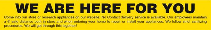 for emergency appliance delivery, installation, and repair to major home appliances. “No Contact” delivery services can be initiated by phone! Check out new appiances on our website; call our expert sales staff with your questions or requests! We’ll maintain a safe six-foot distance when we enter your home to conduct repairs or installation, and we follow strict sanitizing procedures.
