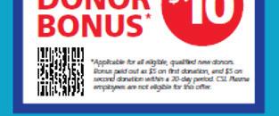 * Applicable for all eligible, quali ed new donors. Bonus paid out as $5 at that donation and $5 on second donation within a 20 day period. CSL Plasma employees are not eligible for this o er. Must present coupon at rst donation. Expires 9/1/2020 Valid at Reynolds Road Only.