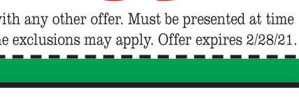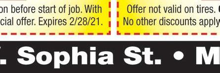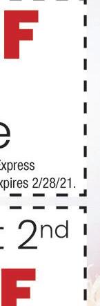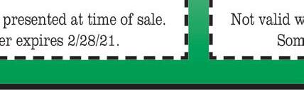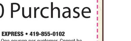 Become a Jed’s “VIP” member & DOWNLOAD OUR FREE APP & redeem your first reward: A FREE Appetizer! Locally Owned & Operated Fireballs & Brew “ e Original Jed’s since 1996” $10 5 FOR DOMESTIC BOTTLE BUCKETS Bud Light, Budweiser, Miller Lite, Yuengling, Coors Light only SATURDAY Beer Special P 7010 Lighthouse Way • Perrysburg 419-874-8481 Buy 1, Get 1 1/2 OFF Excludes other offers. Must present TMS coupon. Valid at Perrysburg location only. Expires 2/28/21 (exlcudes powerballs) DINE IN ONLY Buy a Fireball GET 2ND 1/2 OFF at Reg. Price Visit us at expressocarwash.com for a location near you EXPRESS PROTECTION WORKS WORKS PLUS Unlimited Monthly EXPRESS PASS Unlimited Monthly EXPRESS PASS Unlimited Monthly EXPRESS PASS Unlimited Monthly EXPRESS PASS 24 $ 99 19 $ 99 34 $ 99 WASH TODAY 7 $ $10 $15 $16 WASH TODAY WASH TODAY WASH TODAY 39 $ 99 FREE VACUUMS Lube Shop • Exterior x rte ior 1010 W. Alexis Exter ashes 5440 W. Central x er E t ior ashes GIFT CERTIFICATES AVAILABLE! Works Plus 8 Works Plus 8 Give Up a Dirty Car for Lent!!