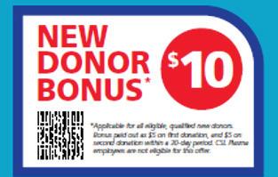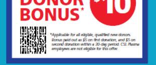 * Applicable for all eligible, quali ed new donors. Bonus paid out as $5 at that donation and $5 on second donation within a 20 day period. CSL Plasma employees are not eligible for this o er. Must present coupon at rst donation. Expires:10/1/2020 Valid at Reynolds Road Only.