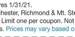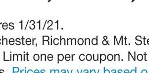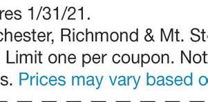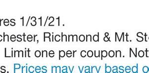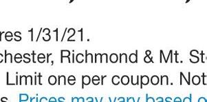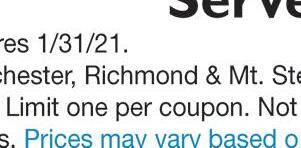 260 Boggs Lane, Richmond (859) 623-4216 Hours: Monday-Friday 9AM-6PM • Saturday 9AM-1PM Check out our new website at McCaysPharmacy.com The Only Pharmacy You Need Make us your one-stop-shop for all your pharmacy needs, and so much more! Like Us On GibsonLn Eastern Bypass Eastern Bypass Artz Dr ArtzDr Boggs Lane Boggs Lane Boggs Lane GibsonLn Stop Light #9 ✓ Free local delivery ✓ Drive-Thru Service ✓ Competitive Prices ✓ One-On-One Customer Service any purchase of $25 or more COUGH DROPS Not valid with any other offer or discount. With coupon only. Expires 1/31/21. Some exclusions apply. Call or come in for details. Not valid with any other offer or discount. With coupon only. Expires 1/31/21. FREE $5OFF Voted Best of the Best Madison Co. 2017-2020 OF THE BEST BEST SLAY YOUR WINTER SNIFFLES! JanuarySpecial Minimum of 25 sq ft 15% OFF TILE! We Now Carry Tile! (859) 575-1558 635.5 Big Hill Ave., Richmond, KY 40475 “Rock & Roll” with Madison County’s ONLY fabrication shop for Granite, Marble, Quartz, and Dekton Countertops! ROcK InTo tHe nEw yEaR! $36 only sq. ft. INSTALLED! 50 sq. ft. Minimum ON SALE NOW! Luna Pearl White Gold