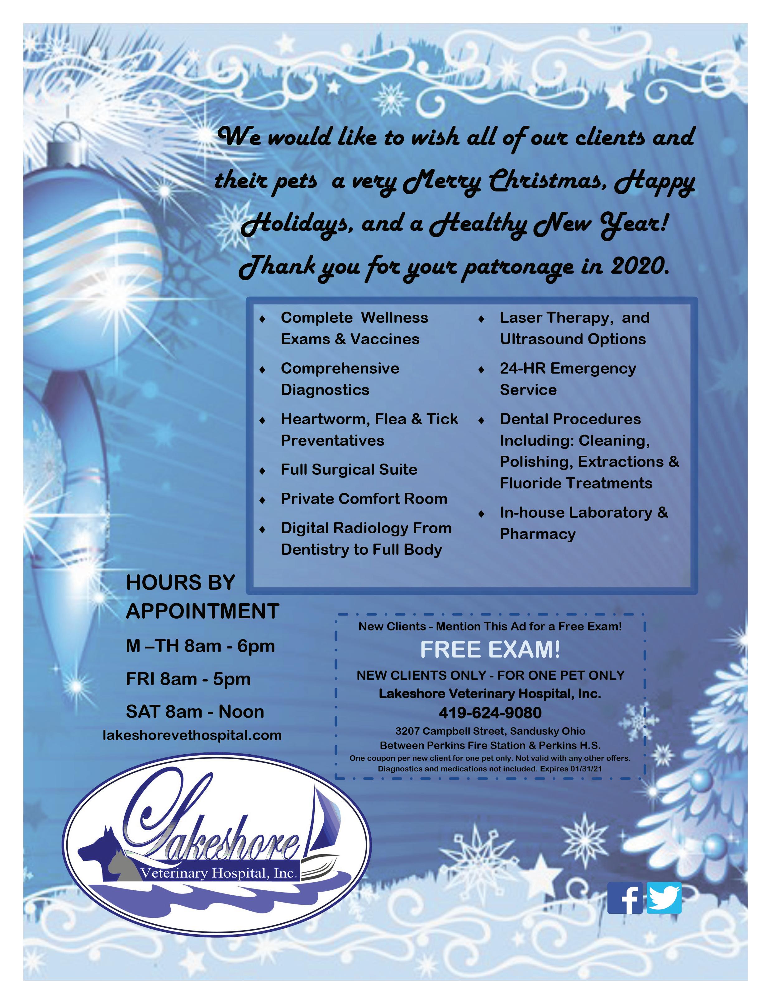 We turn your donations into Habitat homes! “Like” us on Facebook! 419-621-2207 www.firelandshabitat.org 7602 Milan Road • Sandusky Corner of Fox Road, 1/2 mi. S of Kalahari OPEN TO THE PUBLIC We’ll pick up your large items! Call 419-621-2207 OPEN for Seniors Tues-Fri 10-11, Sat 9-10 OPEN to the Public Tues-Fri 11-5, Sat 10-4 Firelands Habitat for Humanity 30th Anniversary Sale! Celebrating 106 homes built in 30 years! Building “Homes of Hope” for 30 Years! 10% OFF EVERYTHING in the store! 30% OFF ANY ONE ITEM! EXCLUDES SHEDS. With this ad. Expires 01-07-21. BEFORE AFTER 77 E. Main St. • Norwalk 419-668-4665 Toll Free 1-800-423-1310 “We take pride in what you stand on.” Mon & Fri 8:30-5 Tues-Thurs 8:30-4 Sat 9-Noon A Full Service Company Since 1980 “Like us” on Visit our website at www.balduffs.com for all your floor covering and carpet cleaning needs. CARPET CLEANING TILE CLEANING FURNITURE CLEANING DUCT CLEANING DON’T GET BLOWN AWAY ...when someone gets to your house, and the price they give you is ten times the amount in their ad! Please call us and we will come out and give you a FREE ESTIMATE for your air duct cleaning or any of your floor care needs. We truly take pride in your home, and we know what you really want: An honest price, with great service! Must present coupon to receive this price. Tax not included. Cannot be combined with other discounts. Offer valid for one visit only. Expires 01-14-21. Balduff’s WHOLE HOUSE DUCT CLEANING $50 OFF Wishing you a Safe, Healthy, and Happy Holiday Season!