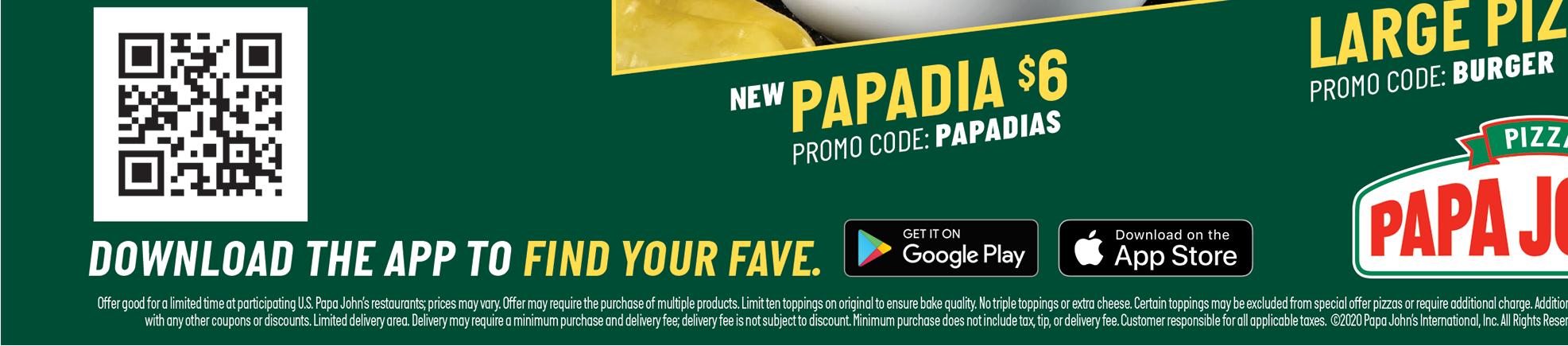 Sandusky 120 E. Perkins Ave. 419 609-9444 ‘Til 3pm weekdays. Carry-out only. Not valid with other offers. Good at participating restaurants. Limited delivery area; charges may apply. Customer responsible for all applicable taxes. Expires 01-15-21. 1 Small 2-Topping Pizza $500 Carryout Only PROMO CODE=Small5 with Drink=Small6 Papa Rewards Points=5 or 6 Not valid with other offers. Good at participating restaurants. Limited delivery area; charges may apply. Customer responsible for all applicable taxes. Expires 01-15-21. Lunch Offer Not valid with other offers. Good at participating restaurants. Limited delivery area; charges may apply. Customer responsible for all applicable taxes. Expires 01-15-21. $1299 PROMO CODE=Largeany12 Papa Rewards Points=12 — Locally Owned & Operated — PAPAJOHNS.COM Now Hiring. Start Today! 2 Medium 2-Topping Pizzas, a 2-Liter, & 10” Cheesesticks ‘Til 3pm weekdays. Carry-out only. Not valid with other offers. Good at participating restaurants. Limited delivery area; charges may apply. Customer responsible for all applicable taxes. Expires 01-15-21. Add a 20 oz. Drink for just $1.00! 1 Medium 1-Topping Pizza $600 Carryout Only PROMO CODE=Medco6 Papa Rewards Points=6 Pizza & Wings! Not valid with other offers. Good at participating restaurants. Limited delivery area; charges may apply. Customer responsible for all applicable taxes. Expires 01-15-21. $1600 Papa Rewards Points=16 PROMO CODE=lgwings16 1 Large up to 2-Toppings Pizza & 8-piece Wings Specialty Bundle Not valid with other offers. Good at participating restaurants. Limited delivery area; charges may apply. Customer responsible for all applicable taxes. Expires 01-15-21. $1999 Papa Rewards Points=19 Any Large up to 5 Toppings Pizza, or Specialty Pizza Papa Rewards Points=20 PROMO CODE=ARK21P Lunch Offer Try our NEW eat-in tables and chairs in our lobby! Your Choice! Meal Deal! $2099 Get The Works or any Large Specialty Pizza, Breadsticks, & a 2-Liter Order on the “Specials” page at www.papajohns.com
