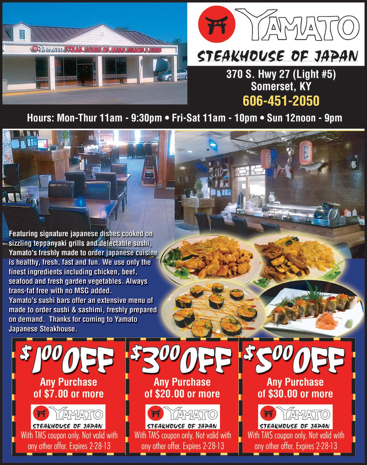 The BLACKEST of BLACK FRIDAY Sales! Huge Discounts Storewide! For every $100 Spent on Gift Cards, get a bonus $10 Card foR FREE! More Sale Details When You Enter The Store On Friday, November 27th! Special Black Friday Hours: 8AM-9PM 450 S Hwy 27, Suite 5 (across from Dairy Queen) Somerset, KY 42501 • (606) 425-4845 With TMS coupon only. Valid on Food portion of bill only, excludes alcohol. Not valid with any other offer. Expires 11/30/20. With TMS coupon only. Valid on Food portion of bill only, excludes alcohol. Not valid with any other offer. Expires 11/30/20. ANY PURCHASE FOOD With TMS coupon only. Valid on Food portion of bill only, excludes alcohol. Not valid with any other offer. Expires 11/30/20. 21184 PAC 0213 21184 PAC 0213 21184 PAC 0213 $5 OFF $10 OFF