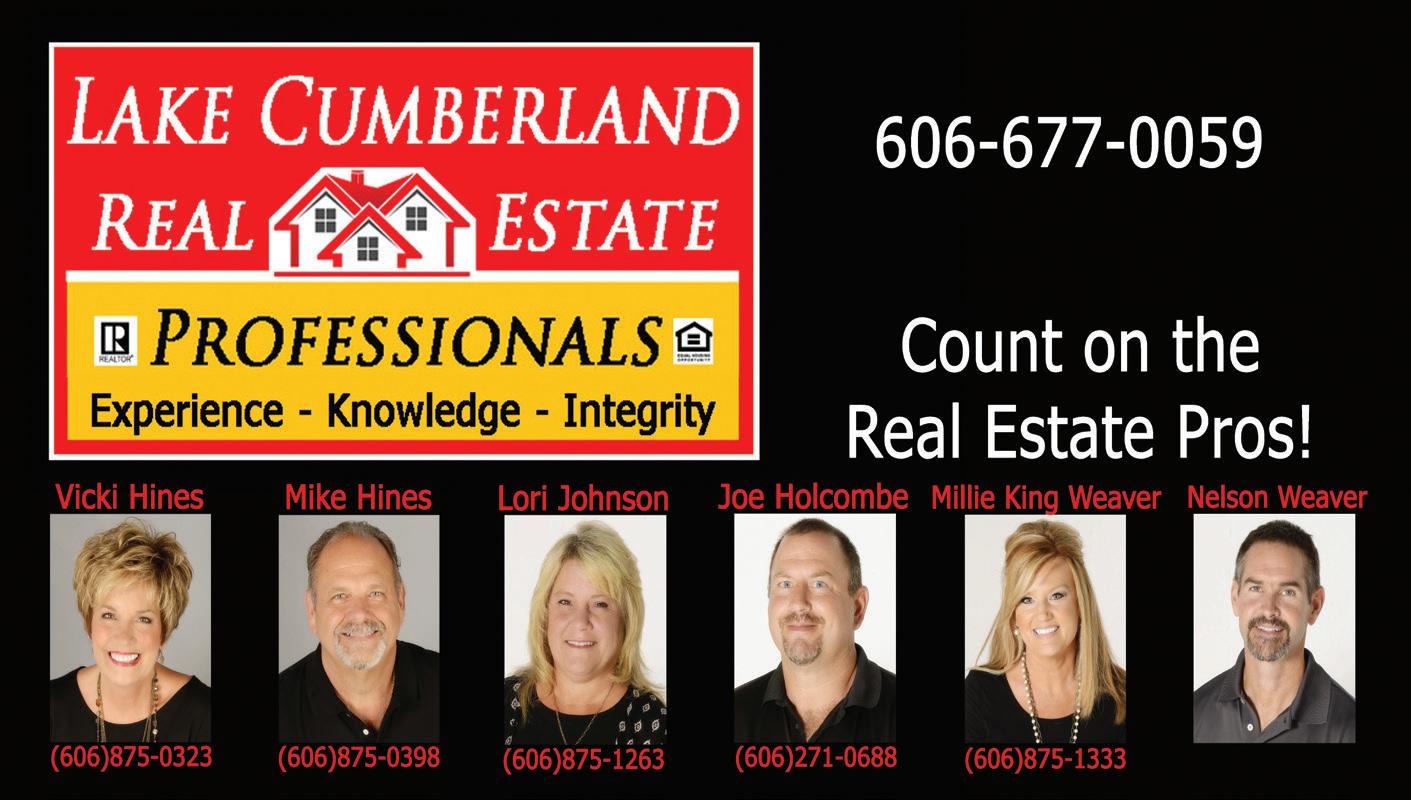 Let Us Help You Buy Or Sell Your Home! 168 Regal Avenue, Somerset $259,900 # 38477 511 N Main Street, Somerset $329,900 # 37682 60 Lindrick Drive, Somerset $389,900 # 38281 www.LakeCumberlandKy.com 606-677-0059 24 Rowena Dr. Suite C, Somerset, KY 42501 Count On The Real Estate Pros!
