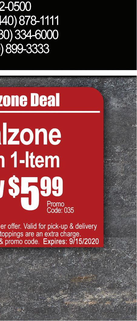 STRONGSVILLE Published By Town Money Saver, Inc. Corporate Office • PO Box 356 • Lucas, OH 44843 © 2018 TMS Franchising, Inc. All rights reserved. For advertising information, call 330-350-2089 NEXT ISSUE IN HOMES: September 10, 2020 ADVERTISING DEADLINE: August 28, 2020 POSTAL CUSTOMER PRSRT STD ECRWSS U.S. POSTAGE PAID Town Money Saver, Inc. townmoneysaver.com 20942 Drake Rd. | Strongsville 440-268-9701 Fax: 440-268-9702 WACKY WEDNESDAY CHICKEN SPECIAL 8 Pc Chicken, JoJo’s & Coleslaw $12.99 Make Your Own 6 PACKS We deliver any order of $25 or more to surrounding areas $3.00 OFF ANY 2 SUBS Excludes corned beef and roast beef sandwiches and ruebens. Not valid with any other offers or specials. With coupon only. One coupon per visit. Expires 9/10/20 $1.00 OFF ANY SUB Excludes corned beef and roast beef sandwiches and ruebens With coupon only. Not valid with any other offers or specials. One coupon per visit. Expires 9/10/20 With coupon only. Not valid with any other offers or specials. One coupon per visit. Expires 9/10/20 12 PC CHICKEN 12 JOJO’S & COLESLAW $16.99 Excludes roast beef and corned beef. Saturdays & Sundays With coupon only. Not valid with any other offers or specials One coupon per visit. Expires 9/10/20 FAMILY DEAL 4 SUBS $20.00 $5.00 OFF ANY PARTY PLATTER (CHICKEN, SUB, CROISSANT, MEAT) $30 OR MORE With coupon only. Not valid with any other offers or specials. One coupon per visit. Expires 9/10/20 P A R T Y P L A T T E R S A V A I L A B L E ! BUY A MEDIUM HAND DIPPED ICE CREAM GET ONE FREE With coupon only. Not valid with any other offers or specials. One coupon per visit. Expires 9/10/20 SAVE $3.99 C A L L F O R D E T A I L S Open Labor Day LUNCH MEAT & CHEESE SPECIALS LOWEST PRICES HUGE SELECTION OF CRAFT BEERS 2 Medium 2-Topping Pizzas $19.99 2 Large 2-Topping Pizzas $24.99 Large 1-Topping Pizza, 12 Wings & a Large Salad $23.99 Large Specialty & Large 1-Topping Pizza $24.99 1/2 Sheet Pizza with 1-Topping $13.99 OR Not valid with any other offer. Expires 9-10-20 Not valid with any other offer. Expires 9-10-20 Not valid with any other offer. Expires 9-10-20 Not valid with any other offer. Expires 9-10-20 Not valid with any other offer. Expires 9-10-20 Medium 1-Topping Pizza (PICK UP ONLY) $8.99