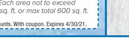 Plus tax. Residential use only. L-shaped areas or areas exceeding 250 sq. ft. are considered 2 areas. Minimum charge $95. Cannot be used with other discounts. Coupon expires 4/30/21 Plus tax. Minimum charge $95. Cannot be used with other discounts. Coupon expires 4/30/21 5 AREAS for $120 3 areas .... $95 4 areas .... $110 5 areas .... $120 6 areas .... $130
