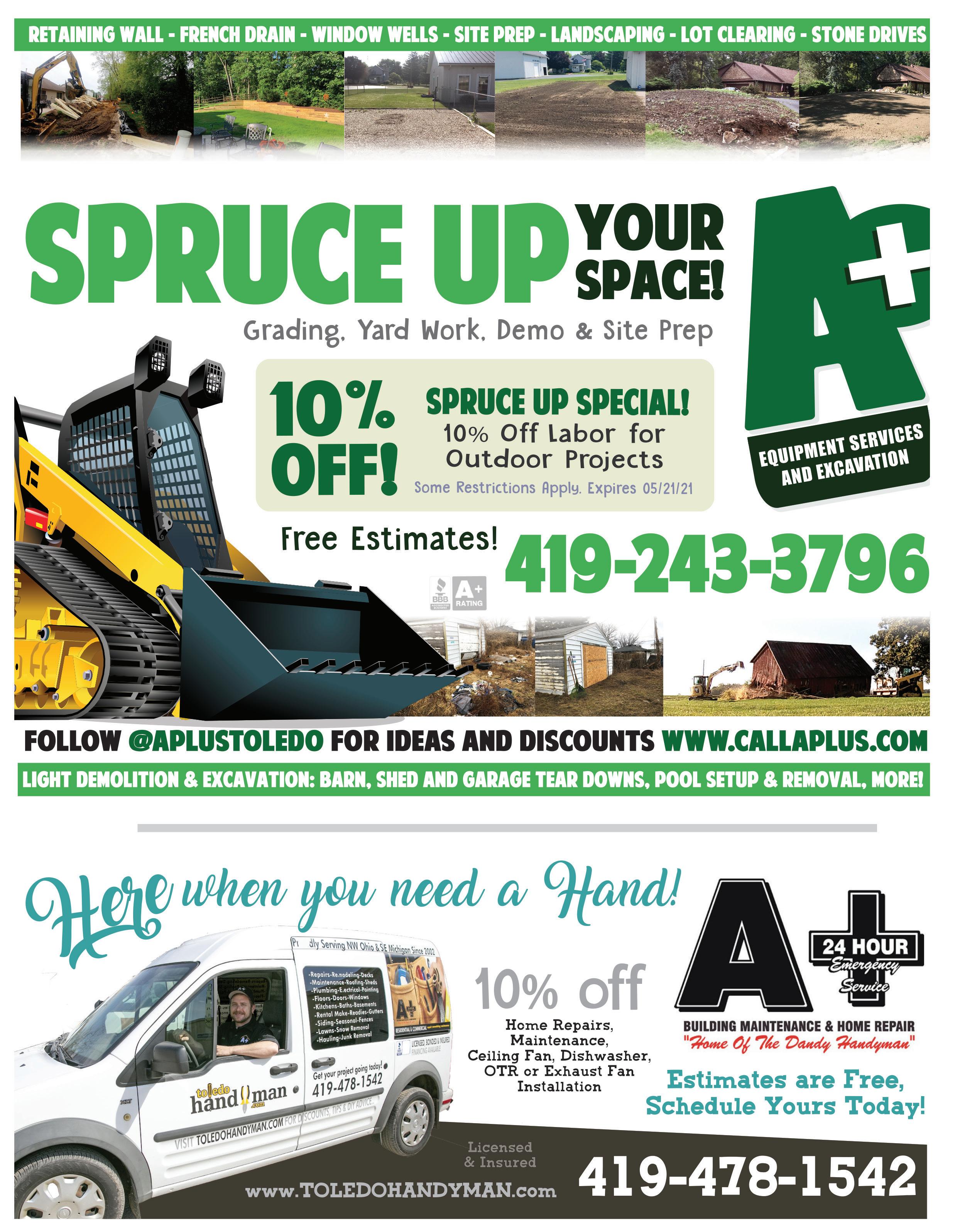 Coupon must be presented at time of purchase only. Excludes alcoholic beverages, gift cards, postage stamps and prior purchases. No cash value/refund. Expires 4/30/21. STMS Wide Variety OF WINES & MICROBREWS Great Bakery & Cheese Selection • Power Washing • Sealing www.hiteconcrete.com Ask about our NEIGHBORHOOD referral discount! Licensed & Insured. Locally owned & operated - Serving Ohio, Michigan & Indiana 10% OFF Any Concrete Leveling Job! OF $200 OR MORE! Must present coupon at time of acceptance. Expires 4/30/21 419-875-4279 1-866-404-4483 Expires 4/30/21 Additional repairs quoted if needed. With coupon. Expires 4/30/21 $12 Walk Behind Lawn Mower TUNE-UP Riding Mower TUNE-UP $6995 $16995 PICK UP & DELIVERY AVAILABLE TMS 4329 W. Alexis www.GreatLakesRents.com 419-720-8922 100 yards w. of Talmadge 10% OFF TMS Tool & Equipment RENTAL UP TO 48 HOUR RENTAL With coupon. Expires 4/30/21 Lawn Mower TUNE - UPS