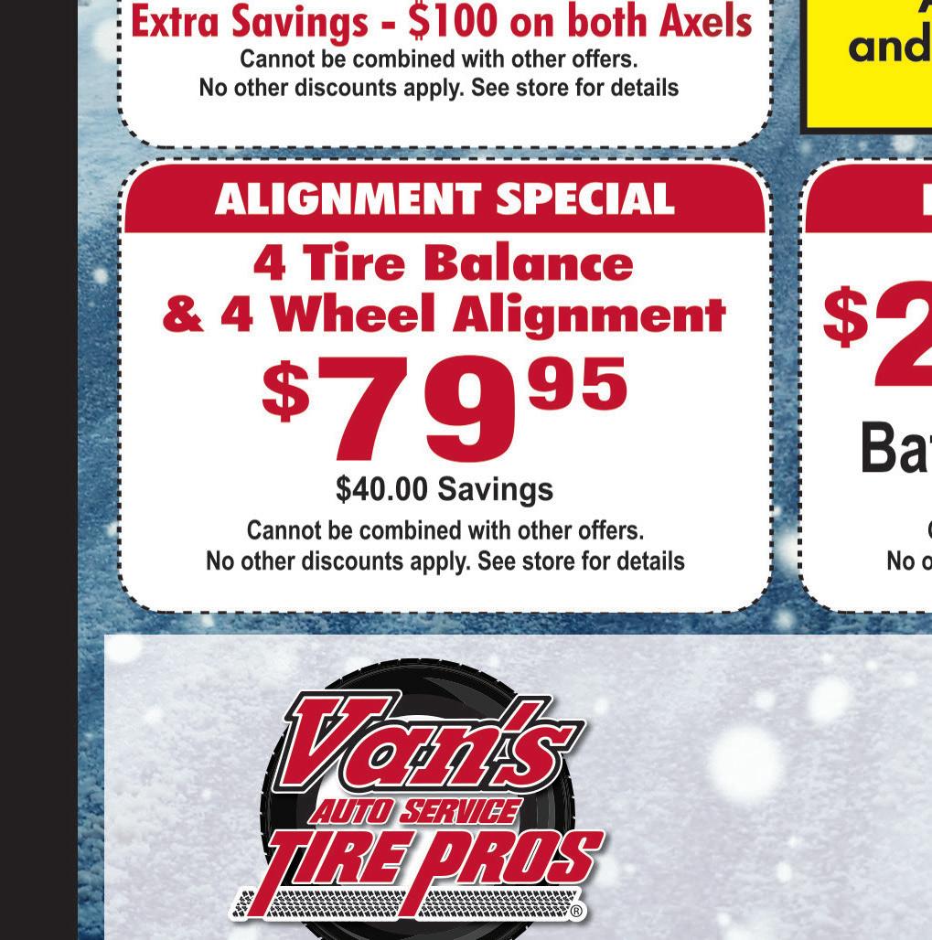 WADSWORTH January 2021 Shop locally. Save locally. Buy ANY 2 Dinners get a 3rd Dinner FREE $5 OFF 16pc Mixed, 20pc Mixed, 10pc All White or 20pc Chicken Tender Buckets (onlyvalidonour3sidedishclassicbuckets) For a Full Menu: www.whitehousechicken.com EXCLUDING DRUMMETTE DINNERS Tuesday Special NO COUPON NECESSARY NOT VALID IN CONJUNCTION WITH ANY ONLINE CHOW NOW ORDERS. Limit one coupon per customer. Must present coupon at time of purchase. Not valid with any other offer. Valid at Wadsworth location only. Expires 1/28/21 NOT VALID IN CONJUNCTION WITH ANY ONLINE CHOW NOW ORDERS. Limit one coupon per customer. Must present coupon at time of purchase. Not valid with any other offer. Valid at Wadsworth location only. Expires 1/28/21 Classic Chicken Dinner $845 Thursday Special 4pc. Chicken Tender Dinner $845 WADSWORTH 199 Great Oaks Trail 330-335-6000 Hours: Mon-Thurs 4pm-9pm • Fri-Sun 11am-9pm Order Online with Order with ChowNow or @www.whitehousechicken.com go to online ordering or on our Facebook Page We now have our own app through Chow Now! Download to your phone for online ordering and delivery through Chow Now at both Wadsworth and Green locations. Sign up for our new loyalty program through Chow Now! DOWNLOAD OUR NEW APP TODAY! DON’T BUY TIRES ANYWHERE UNTIL YOU TALK TO VAN’S 185 Broad St • Wadsworth 330-336-6630 • vanstirepros.com BEST ENGINE PROTECTION BETTER ENGINE PROTECTION GOOD ENGINE PROTECTION BRAKE SERVICE FULL SYNTHETIC with MAXLIFE TECHNOLOGY™ $4995 Regular $59.95 MAXLIFE™ SYNTHETIC BLEND Regular $44.95 Selected vehicles may vary. (Up to 6 quarts) Coupons may not be combined with any other offer Expires 1/28/21 PREMIUM CONVENTIONAL $2495 Regular $29.95 Selected vehicles may vary. (Up to 6 quarts) Coupons may not be combined with any other offer. Expires 1/28/21 Coupons may not be combined with any other offer. See store for details. Expires 1/28/21 $3495 Selected vehicles may vary. (Up to 6 quarts) Coupons may not be combined with any other offer. Expires 1/28/21 FREE TIRE ROTATION FREE TIRE ROTATION FREE TIRE ROTATION SAVE$40 OFF Extra Savings - $100 on both Axels PER AXEL Soup & Salad Fish Sandwich 1/2 Turkey & Swiss on Rye 3 Chicken Finger Quarter Pound Burger 1/2 Italian Sub 1/2 Wrap (Chicken or Turkey) Grilled Cheese Ham & Cheese (Hot or Cold) 2 Fish Tacos Taco Salad (No Side) 6 Boneless Wings Pulled Pork Sandwich Downtown Wadsworth 146 Main Street Wadsworth ALEXANDRI’S RESTAURANT “Great Food, Great Service, Unbeatable Prices” Serving Medina County 30 Years! BREAKFAST 2 Eggs, Choice of Homefries, Fruit or Grits with Toast • Bacon, Sausage or Ham $399 Valid Mon-Fri till 11am Only Valid only with coupon. Not valid with any other offer or specials. Expires 1-28-21 Valid Mon-Fri Open till 11am Only Valid only with coupon. Not valid with any other offer or specials. Expires 1-28-21 ALEXANDRI’S FAMILY RESTAURANT DINNER FOR 2 Choice of Pork Chops, Grilled Tilapia, Salmon or Top Sirloin $1795 Valid only with coupon. Not valid with any other offer or specials. Expires 1-28-21 Includes Potato, Vegetable, Soup & Salad ALEXANDRI’S FAMILY RESTAURANT Valid only with coupon. Not valid with any other offer or specials. Expires 1-28-21 ALEXANDRI’S FAMILY RESTAURANT limit 2 per table limit 2 per table BREAKFAST 2 Pancakes or 2 French Toast, Choice of Bacon, Sausage or Ham $399 ALEXANDRI’S FAMILY RESTAURANT ALEXANDRI’S FAMILY RESTAURANT ALEXANDRI’S FAMILY RESTAURANT Valid 11am to Close Valid only with coupon. Not valid with any other offer or specials. Expires 1-28-21 Specials excluded. Valid only with coupon. Not valid with any other offer or specials. Expires 1-28-21 DINNER FOR 2 1/2 Dozen Breaded Jumbo Shrimp $749 Valid 11am till Close (Limit 2 per coupon) Each Includes Potato or Vegetable, Soup or Salad oin s ver Frida for Fis Fry Accepting Credit Cards Join Us Every Friday a Fish ver aturday rime ib Every Saturday Prime Rib Valid 11am to Close Classic Gyro Sandwich With Fries & a Cup of Soup $749 (Limit 2 per coupon) BURGER SPECIAL $200 OFF Any Burger off menu Includes Fries Valid 11am till Close