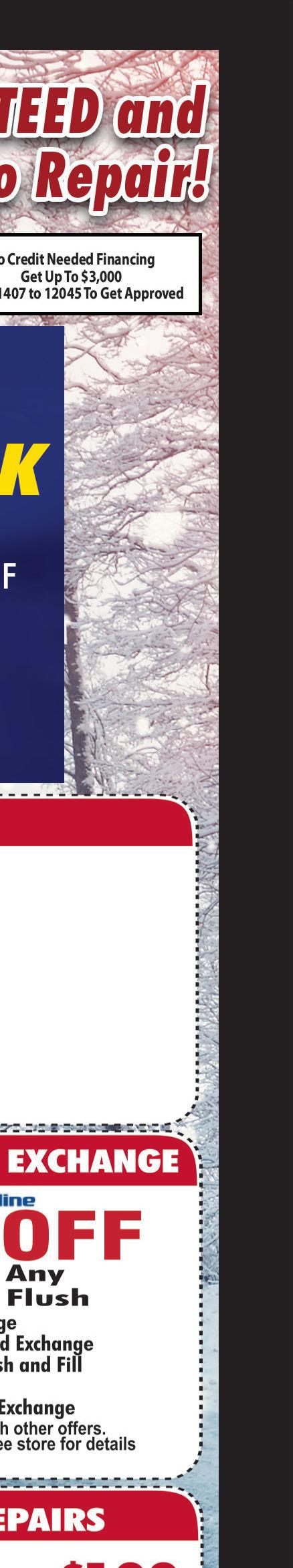 www.conradsheating.com license #30219 RESIDENTIAL & COMMERICAL SERVICE INSTALLATION AND MAINTENANCE $95 FURNACE CHECK ROPANE FURNACES ONLY, DOES NOT INCLUDE BOILER/OIL FURNACES) Valid only during normal business hours. Cannot be combined with other offers. No additional discounts. Terms and conditions apply. Expires 3/31/21 $30 OFF COMPLETED REPAIR (GAS/PROPANE FURNACES ONLY, DOES NOT INCLUDE BOILER/OIL FURNACES) Valid only during normal business hours. Cannot be combined with other offers. No additional discounts. Terms and conditions apply. Expires 3/31/21 $200 OFF AERUS WHOLE HOUSE Cannot be combined with other offers. No additional discounts. Terms and conditions apply. Expires 3/31/21 $4 OFF ULTIMATE HOT WAX OR WORKS WASH 1234 High Street location.Not valid with any other offers. Expires 1/28/21 Must Present Coupon. Not Valid With Any Other Offer. 1234 High St, Wadsworth. Expires 1/28/21 $5 OFF NY OIL CHANGE www.facebook.com/ Petitsautowashandlube FREE VACS FROM 8AM-8PM WADSWORTH’S TOUCH-ONLYFREE AUTO WASH! SPECIAL WORKSFREEWASH withAnyOilChange