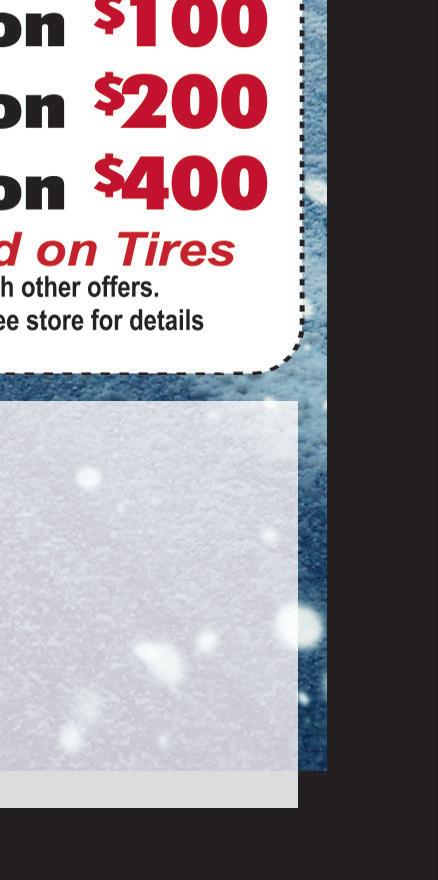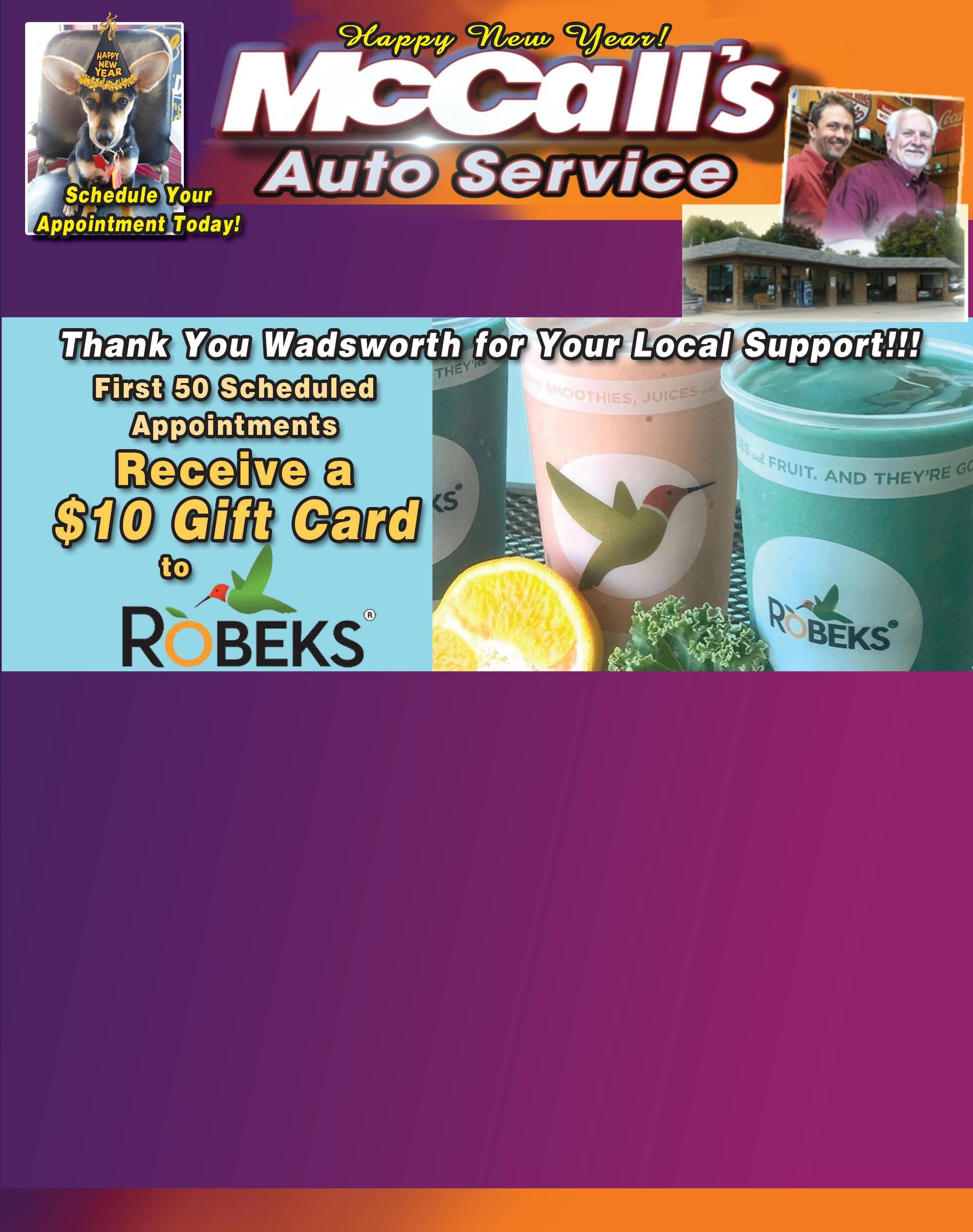 We can remove auto door dings & small dents keep your paint original maintaining your cars value & integrity, fast & affordable! Per Dent ($35 Thereafter) Paintless Dent Removal starting at ATTN: DIY GUY We Will Turn Your Brake Rotors $1200 Cooling System Flush $6995 (Within Wadsworth City Limits) each (Carry-In Only) With Coupon Only. Not valid with any other offer. McCall’s NAPA Auto Service. Please present coupon before service. Expires 1-28-21. With Coupon Only. Not valid with any other offer. McCall’s NAPA Auto Service. Please present coupon before service. Expires 1-28-21. $8595 With Coupon Only. Not valid with any other offer. McCall’s NAPA Auto Service. Please present coupon before service. Expires 1-28-21. With Coupon Only. Not valid with any other offer. McCall’s NAPA Auto Service. Please present coupon before service. Expires 1-28-21. Conventional OIL CHANGE & FILTER $2495 (up to 5qt oil) OIL CHANGE & FILTER OIL CHANGE & FILTER Full Synthetic Semi Synthetic Blend Excludes Diesels. With Coupon Only. Not valid with any other offer. McCall’s NAPA Auto Service. Please present coupon before service. Expires 1-28-21. PLUS FREE Tire Rotation $3495 (up to 5qt oil) Excludes Diesels. With Coupon Only. Not valid with any other offer. McCall’s NAPA Auto Service. Please present coupon before service. Expires 1-28-21. PLUS FREE Tire Rotation $4995 (up to 5qt oil) Excludes Diesels. With Coupon Only. Not valid with any other offer. McCall’s NAPA Auto Service. Please present coupon before service. Expires 1-28-21. PLUS FREE Tire Rotation 10% OFF ANY REPAIR (Excludes Tires & Oil Change) With Coupon Only. Not valid with any other offer. McCall’s NAPA Auto Service. Please present coupon before service. Expires 1-28-21. FREE TOWING With Any Repair Over $100 Brake Special (Includes Free Tire Rotation) We will replace pads or shoes including machining rotors or drums and inspect and rotate your tires. $22500 per axle with OEM Factory Pads Foreign cars & trucks may be slightly higher. With Coupon Only. Not valid with any other offer. McCall’s NAPA Auto Service. Please present coupon before service. Expires 1-28-21. COOLANT SYSTEM FLUSH $6995 With Coupon Only. Not valid with any other offer. McCall’s NAPA Auto Service. Please present coupon before service. Expires 1-28-21. TRANSMISSION SERVICE $18999 With Coupon Only. Not valid with any other offer. McCall’s NAPA Auto Service. Please present coupon before service. Expires 1-28-21. Includes Filters & Fluids mccallautoservice.com 330.336.8530 • 400 College St • WADSWORTH Mon-Fri 8am-5pm CLOSED Sat & Sun Proudly Serving Wadsworth for 37 Years!