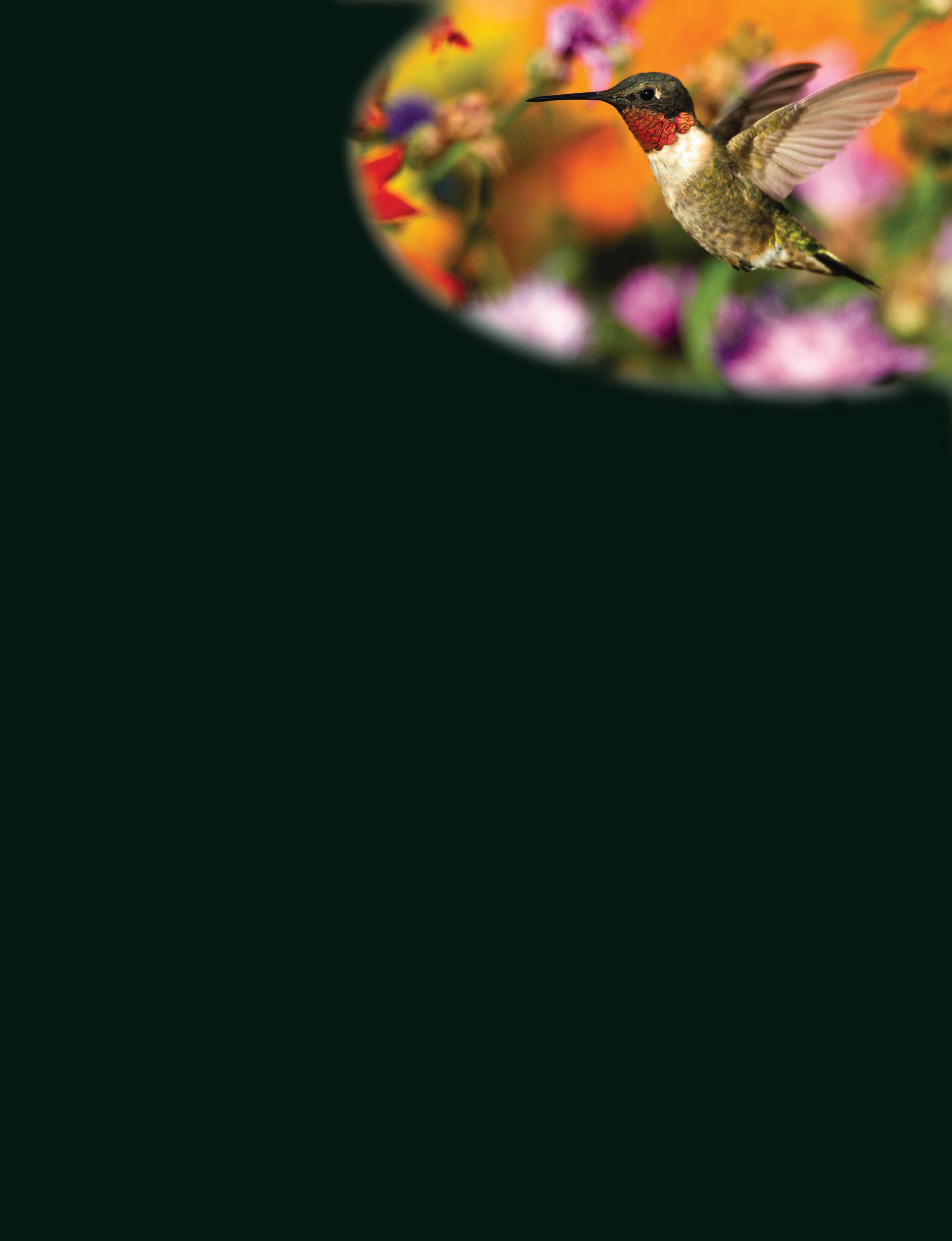 Our extremely popular Ruby-throated Hummingbird has been migrating between North and Central America for thousands of years; a round trip in which millions of hummingbirds instinctively participate. ese smallest of birds are very easy to attract; they will feed from brightly colored owers that are tubular in shape and catch small ying insects in your yard. Another easy way to attract hummingbirds is to place feeders with nectar in your yard. It’s very important to keep the nectar fresh, since a feeder with soured nectar will arouse suspicion therea er. Be sure to get a feeder out soon; a food source is a great way to attract hummingbirds as they set up nesting territories. Migrants will continue to arrive through early May, and then a er nesting their young will be searching for food as well. Hummingbirds will begin heading back to Mexico and Central America in late summer.